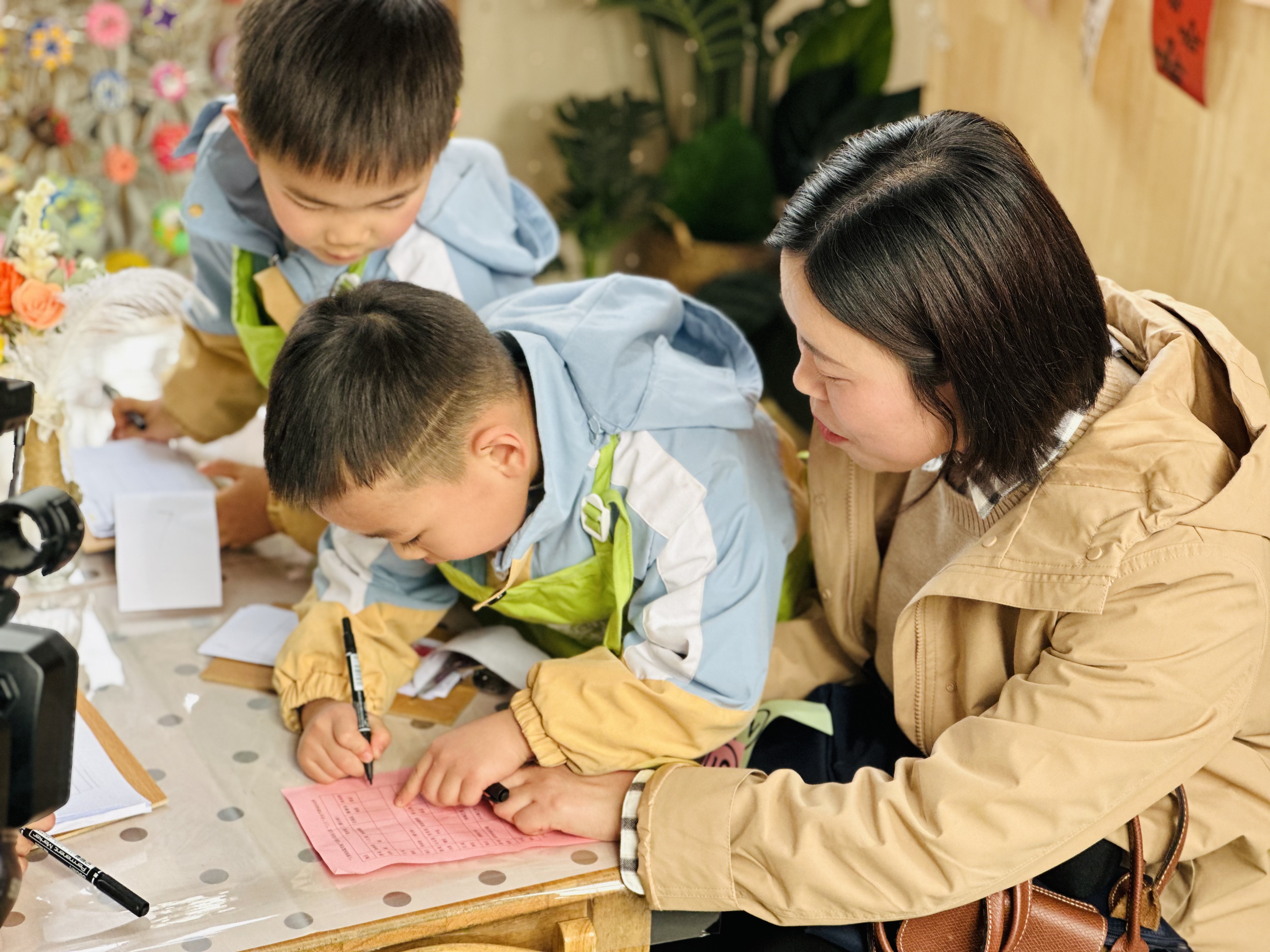 下午三点,活动正式开始,随着妈妈们陆续入园,孩子们也在自己的摊位前使出浑身解数,卖力地招揽顾客。家长们手持游戏任务单开始参与体验,每完成一项,就会有老师在相对应项目的位置上打勾,等全部体验完成,就可以拿着“爱心体验劵”去换购孩子们亲手制作的礼物。不一会儿,妈妈们个个收获颇丰,脸上洋溢着幸福的微笑。
