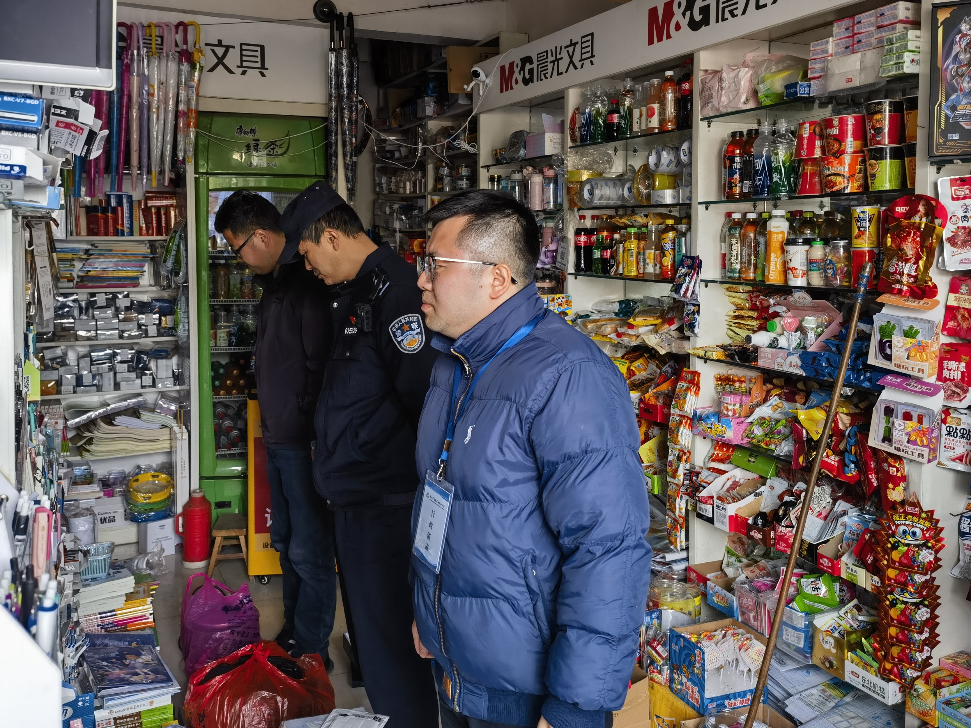巡查小组走进校前街各商户检查是否售卖“三无”产品或烟火、鞭炮等危险类小玩具的违规行为。在巡查中,巡查小组耐心地向商户讲解在学校周边经营更加要注意商品、食品安全卫生要求,引导各商户做好门前三包,倡导商户合法经营、文明经营。