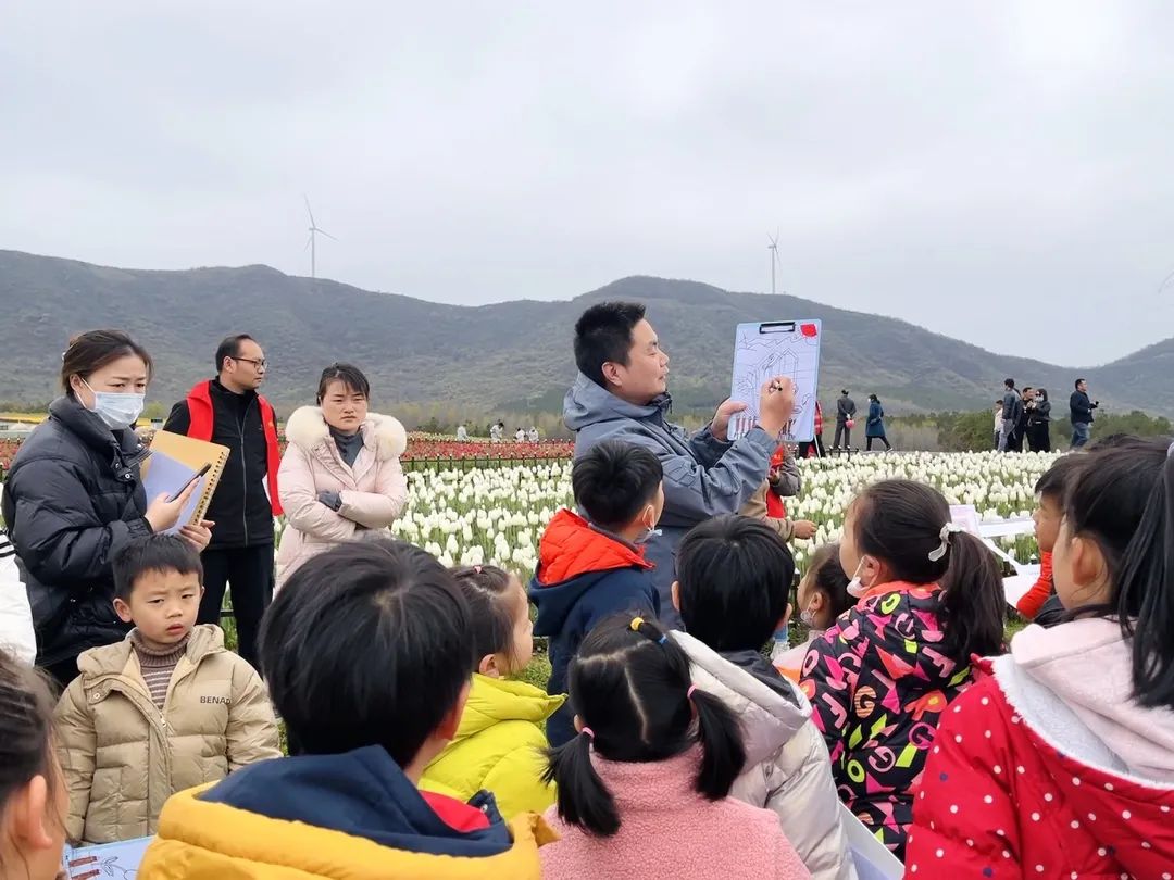 在这个由浪漫郁金香交织而成的“自然大课堂”中,除了现场教学,榆木先生走近作画的小朋友身旁,细心指导、互动交流,为小朋友们带来了一场生动的写生美育课。