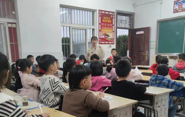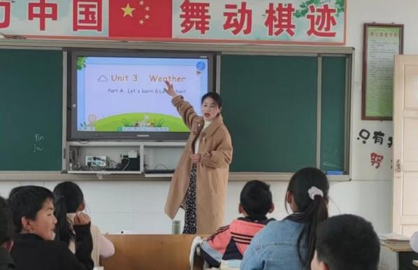 2023年春节刚过的一天下午,乍暖还寒,界首市戴桥中心小学校园里,孩子们欢腾雀跃,唱歌跳舞,打球下棋……老师们正为孩子们上延时服务课。在英语角,一个年轻女教师身材瘦小,眉清目秀,面色红润,身穿鹅黄大衣,与一群孩子正用英语对话: