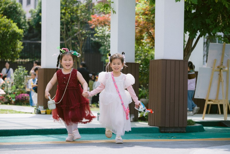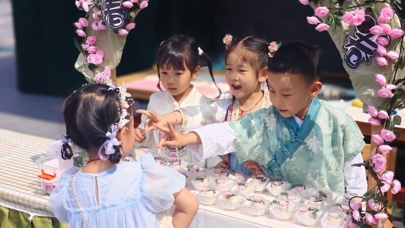 开放日当天,蔷薇长廊化身立体课程空间。作为幼小衔接基地园,幼儿园特别邀请了甘棠小学学生与幼儿共同参与活动。花艺工作坊内,小工匠专注制作永生花书签;“香遇食光”区飘散着孩子们自制的蔷薇花饼香气;户外“花影寻踪”藏宝游戏中,大孩子主动带领小孩子协作探索。在跨学段的互动中,“暖己暖他”的课程内核在双向衔接中自然流淌。