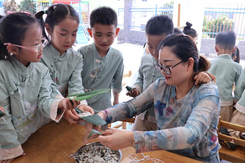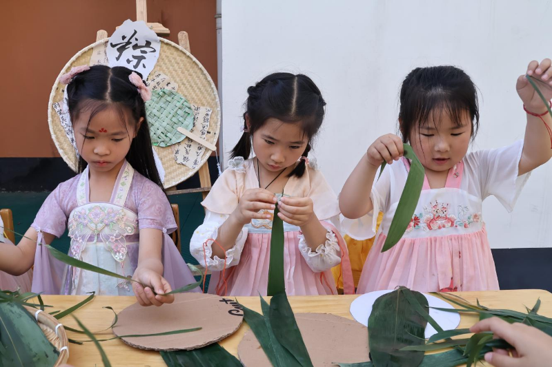 孩子们亲手制作“艾草花束挂件”“香囊”“粽叶扇”“绿豆糕”“粽子”“咸鸭蛋”,体验传统技艺与美食制作,不仅了解了端午节的传统习俗,还锻炼了动手能力,深刻体会到传统文化的魅力。