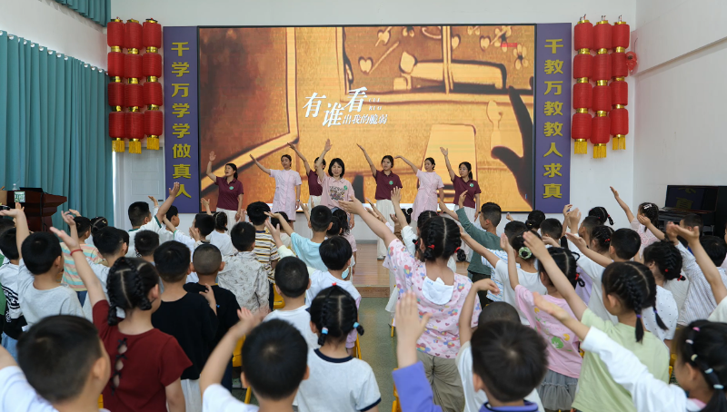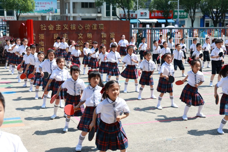 海阳二小举办以“传承文化根脉 点亮童年记忆”为主题的六一特色活动,立足学生年龄特点,设计分年级体验活动,通过“运动展演、礼仪习养、艺术表达、实践创造”四大维度,让学生在欢乐中感受传统文化魅力。在低年级的乒乓球操展演环节,学生们手拿乒乓球拍,身体随着韵律而有节奏地舞动。他们时而蹲步,时而跳跃,动作整齐划一、动感十足,展现了新时代少年儿童昂扬向上的精神风貌和健康的身体素质。