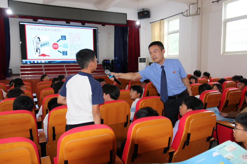 为了增强互动性,提高学生的参与度,检察干警还设置了现场问答环节。针对干警提出的法律问题,学生们积极思考,踊跃回答,现场气氛热烈。对于回答正确的学生,检察干警送上了精心准备的小奖品,以资鼓励。通过互动问答,学生们不仅加深了对法律知识的理解,还学会了如何运用法律武器维护自己的合法权益。