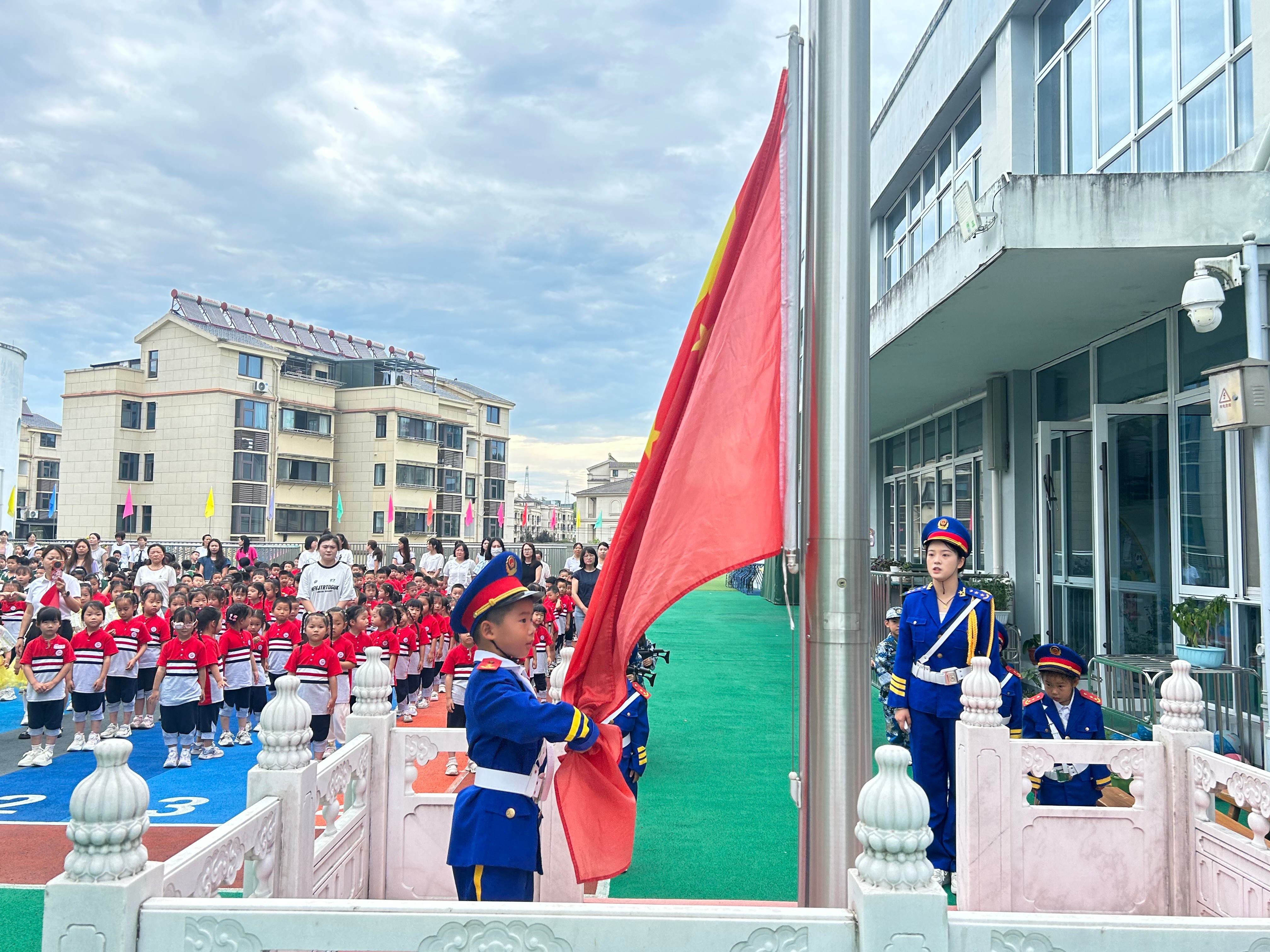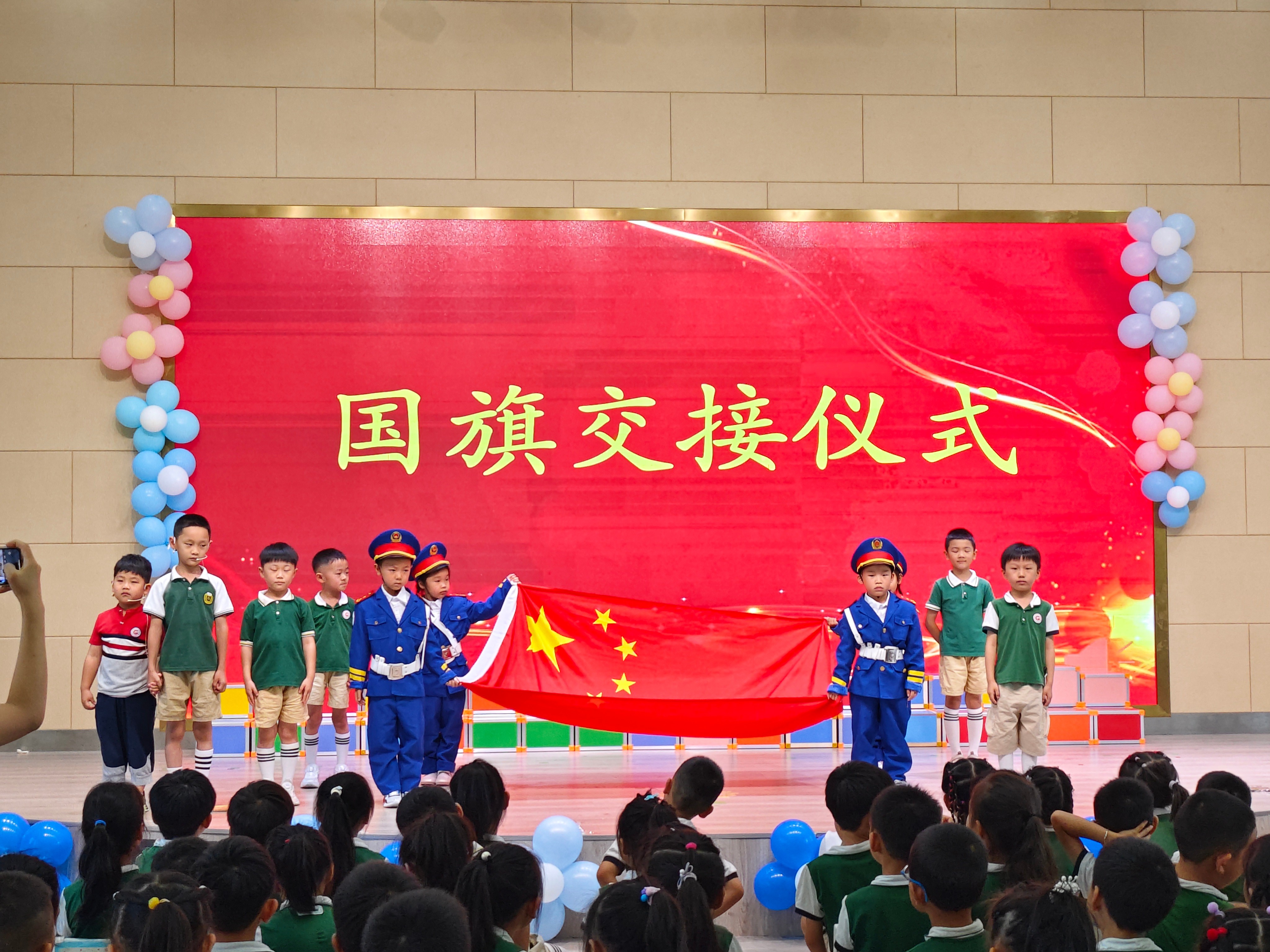伴随着激昂的出旗曲,大班护旗手们昂首挺胸,手捧鲜艳的五星红旗,迈着整齐有力的步伐走向队列。当中班的小朋友们从哥哥姐姐手中郑重接过国旗的那一刻,不仅标志着大班护旗手光荣使命的圆满落幕,更象征着一份责任的接力。全园师幼的目光聚焦于这面鲜红的旗帜,见证着这份特殊的传承。