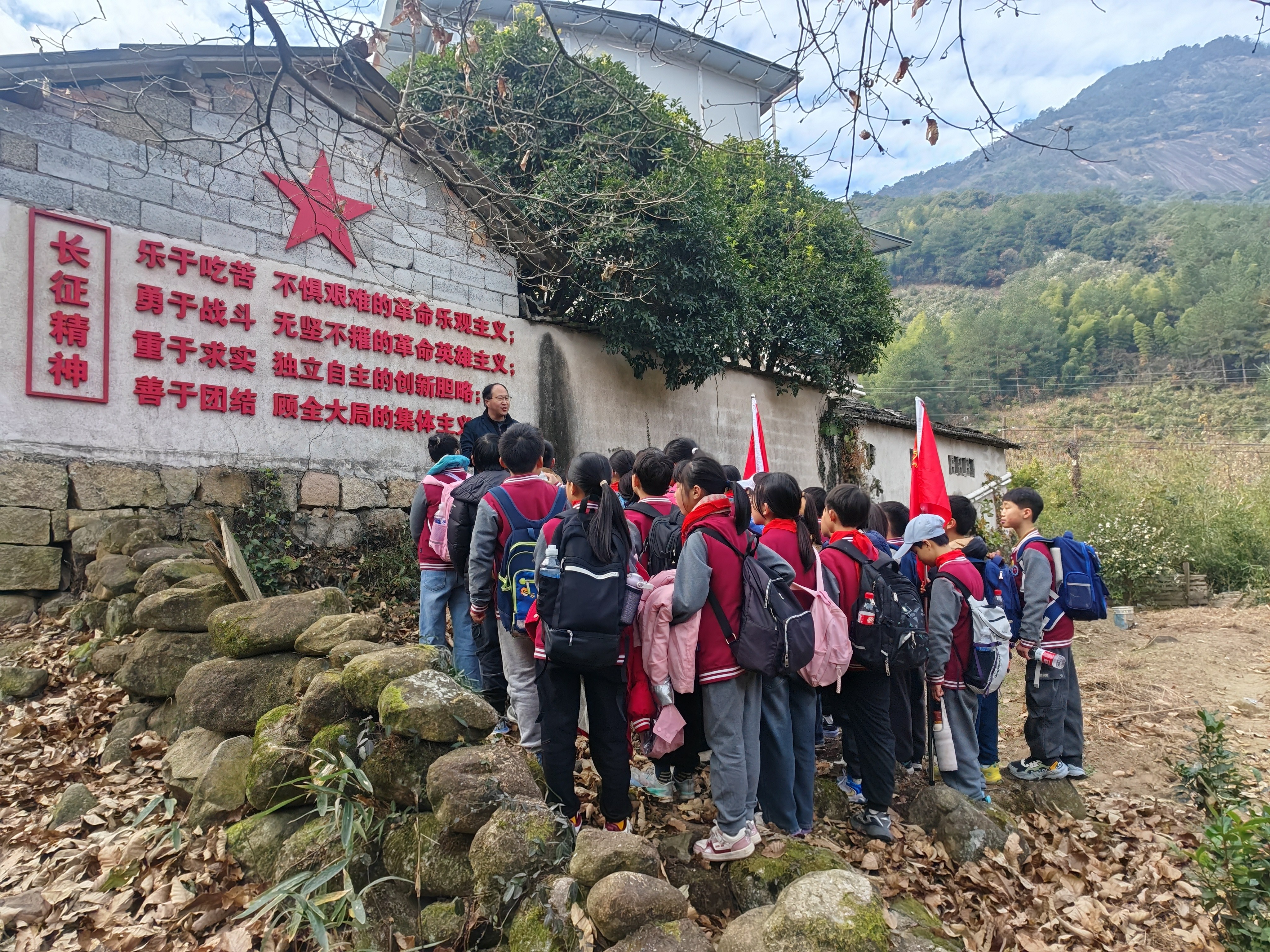 早上8:30,各校在简朴的动员仪式后,整队出发。中心校的同学们从学校出发,途经小岭下、阮坑、长镇,最终抵达徽州区梅川。汤口小学的队伍则选择了一条自然与人文交织的路径:从学校出发,经东里、翡翠谷、凤凰源、黄狮谠、丰大,最终到达北上抗日纪念馆。冈村小学的孩子们则沿着进灶坞路口,踏上山河相间的道路,在革命前辈打游击的山路中前行。