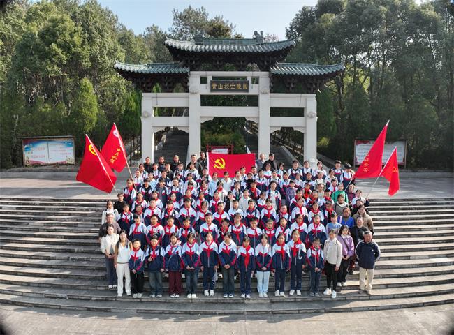 当日,全体师生和镇村志愿者们怀着崇敬之心开启远足征程,经过两个半小时的长途跋涉,顺利抵达目的地——黄山烈士陵园。祭奠仪式在庄严肃穆的氛围中拉开序幕,大家排成整齐的方队,肃立在烈士纪念碑前,共同为南京大屠杀死难者及革命英烈默哀,以寄托哀思、缅怀先烈。默哀结束后,大家向革命烈士敬献花篮,表达对英烈们的崇高敬意。随后,红领巾代表以“从抗战精神到青年担当——铭记历史,守护和平”为题发表讲话,分享感悟与担当,言辞恳切、振奋人心。最后,全体活动参与者举起右拳,庄严宣誓,誓言铿锵有力,彰显了新时代青少年传承红色基因、守护和平的坚定决心。