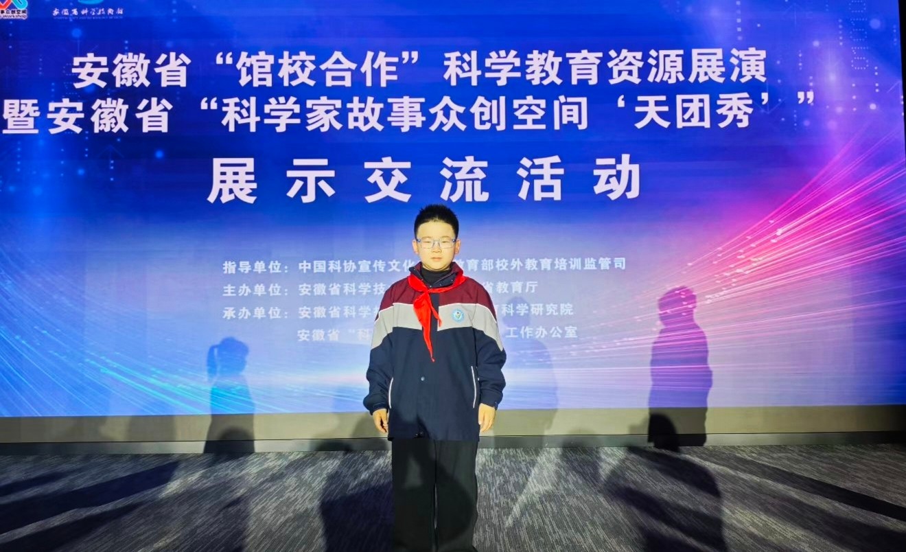 据悉,12月5日至7日,由安徽省科学技术协会、安徽省教育厅主办的安徽省“馆校合作”科学教育资源展演暨安徽省“科学家故事众创空间‘天团秀’”展示交流活动在安徽省科技馆开展。展演中,作为黄山市唯一青少年代表,黟县碧阳小学章秉则精彩亮相,他以清晰流畅、富有感染力的语言讲述了《导弹之父钱学森》的故事,生动诠释了科学家们爱国、创新、求实、奉献的精神内核,展现了新时代少年对科学精神的深刻理解与主动传承,赢得了现场观众与专家的好评。该作品获评“科学家精神宣讲”项目(青少年组)优秀展演作品。