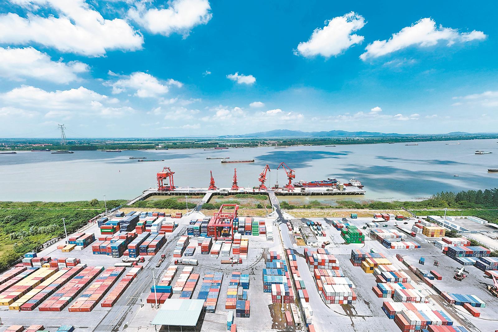 今年上半年,铜陵港口经济稳中向好,港口货物吞吐量、外贸进出口量、集装箱吞吐量增长显著。图为铜陵港长江外贸码头吊装设备正在进行集装箱装卸作业。 本报通讯员 储著传 摄/视觉安徽
