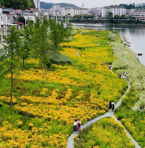 入夏以来,祁门县阊江湿地景区满目金黄的金鸡菊次第绽放,宛如金色的海洋,一片片金黄色的花海和潺潺流淌的清清阊江水相映衬,把祁门装扮得绚丽夺目。