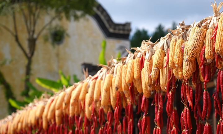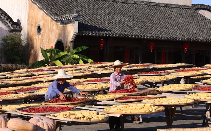 漫步在这座拥有1800多年历史的古村,时光仿佛在此放慢了脚步。徽派古建的屋檐下、窗台上、晒场上,处处都铺满了丰收的喜悦:火红的辣椒似跳跃的火焰,金黄的玉米如灿烂的阳光,橙黄的南瓜像圆润的灯笼。这些鲜活的色彩与白墙黛瓦的徽派建筑相映成趣,勾勒出一幅独具徽州风情的秋日画卷。村民们娴熟地翻晒着各类农作物,指尖的动作不仅是对传统农耕文化的坚守与传承,更让这幅秋日图景有了温度,成为古村中一道靓丽又动人的风景线。