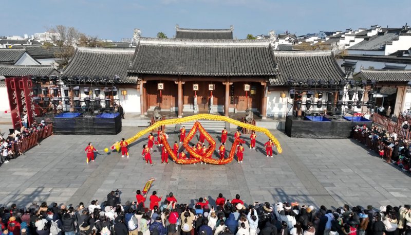 在徽州府衙广场,每日精心安排的民俗节目接力上演。舞布龙、舞麒麟等徽州民俗饱含着国泰民安、送福纳瑞的深情,是徽州地区传承已久的年节符号。当夜幕降临,一盏盏手工非遗鱼灯同时点亮,化作流光溢彩的河流,将节日的氛围推向高潮。