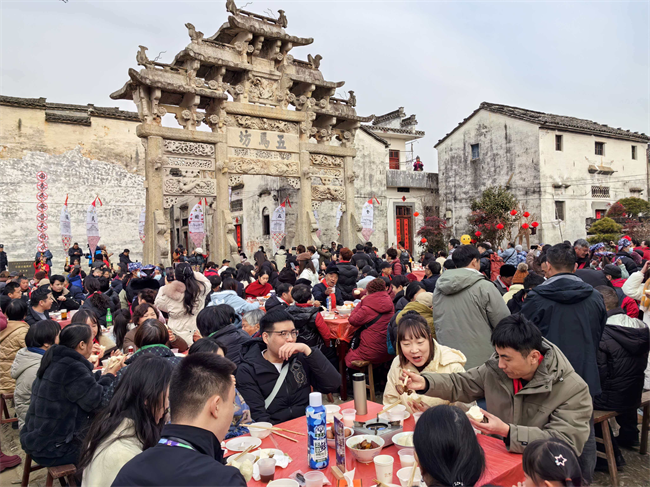临近中午,许村的“年猪宴”拉开帷幕。村民在戏台前支起桌子,端上特色菜肴,游客一边品尝徽菜,一边欣赏民俗表演。“白天逛古村、访牌坊,冬日还能登古道赏雪景,中午赶“年猪宴”、看非遗展演,晚上吃农家宴,这样的度假节奏太惬意了。”南京游客王先生说。