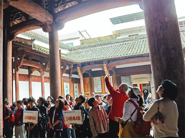 为保证每位学生获得充分的体验,全体学生分为两批错峰行进。第一批学生先上山至下汰观景台,并开展徒步,在行进中感受“绿水青山就是金山银山”的实践成果,随后乘坐云巅滑道从山巅直达山脚,在速度与风景交织的“大号滑滑梯”中收获童趣与欢乐。第二批学生先在山下开展户外拓展活动,通过趣味游戏与协作挑战增强团队凝聚力,随后走进国家级文物保护单位——吴氏宗祠(叙伦堂与春晖祠),聆听村志编纂者之一吴明霓老师的细致讲解,在精美的木雕、砖雕与宏大建筑格局中领略徽派古建的匠心独运。