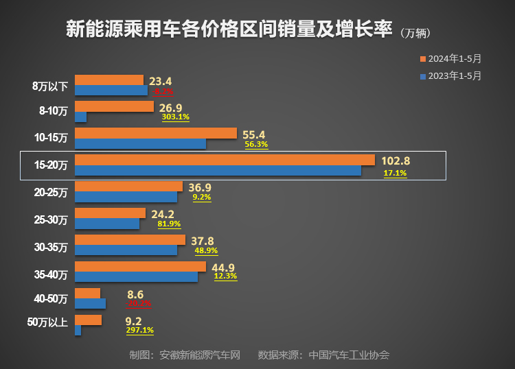 按售价区间分,1-5月,传统燃料乘用车中,15-20万、30-35万以及40-50万价格区间销量呈正增长,目前销量仍主要集中在10-15万价格区间,累计销售209.9万辆,同比微降0.5%;新能源乘用车中,除8万以下、40-50万价格区间销量下降外,其他价格区间销量均呈正增长。目前销量仍主要集中在15-20万价格区间,累计销售102.8万辆,同比增长17.1%。