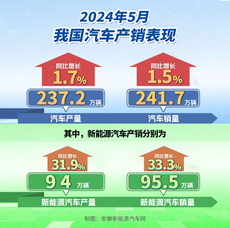 日前,中国汽车工业协会发布了2024年5月的产销报告。报告显示,5月,我国汽车产销分别完成237.2万辆和241.7万辆,同比分别增长1.7%和1.5%。其中,新能源汽车产销分别完成94万辆和95.5万辆,同比分别增长31.9%和33.3%。