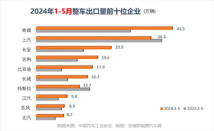 1-5月,从增速上来看,比亚迪累计出口17.9万辆,同比增长1.6倍;长城累计出口16.3万辆,同比增长65.2%;长安累计出口23.9万辆,同比增长64.1%。