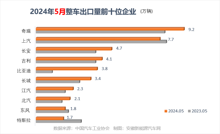 在出口整车企业中,5月,奇瑞出口量达9.2万辆,同比增长24.8%,占总出口量的19.2%。1-5月份,奇瑞累计出口汽车43.51万辆,同比增长31%。与上年同期相比,比亚迪出口增速也颇为显著,出口达3.8万辆。
