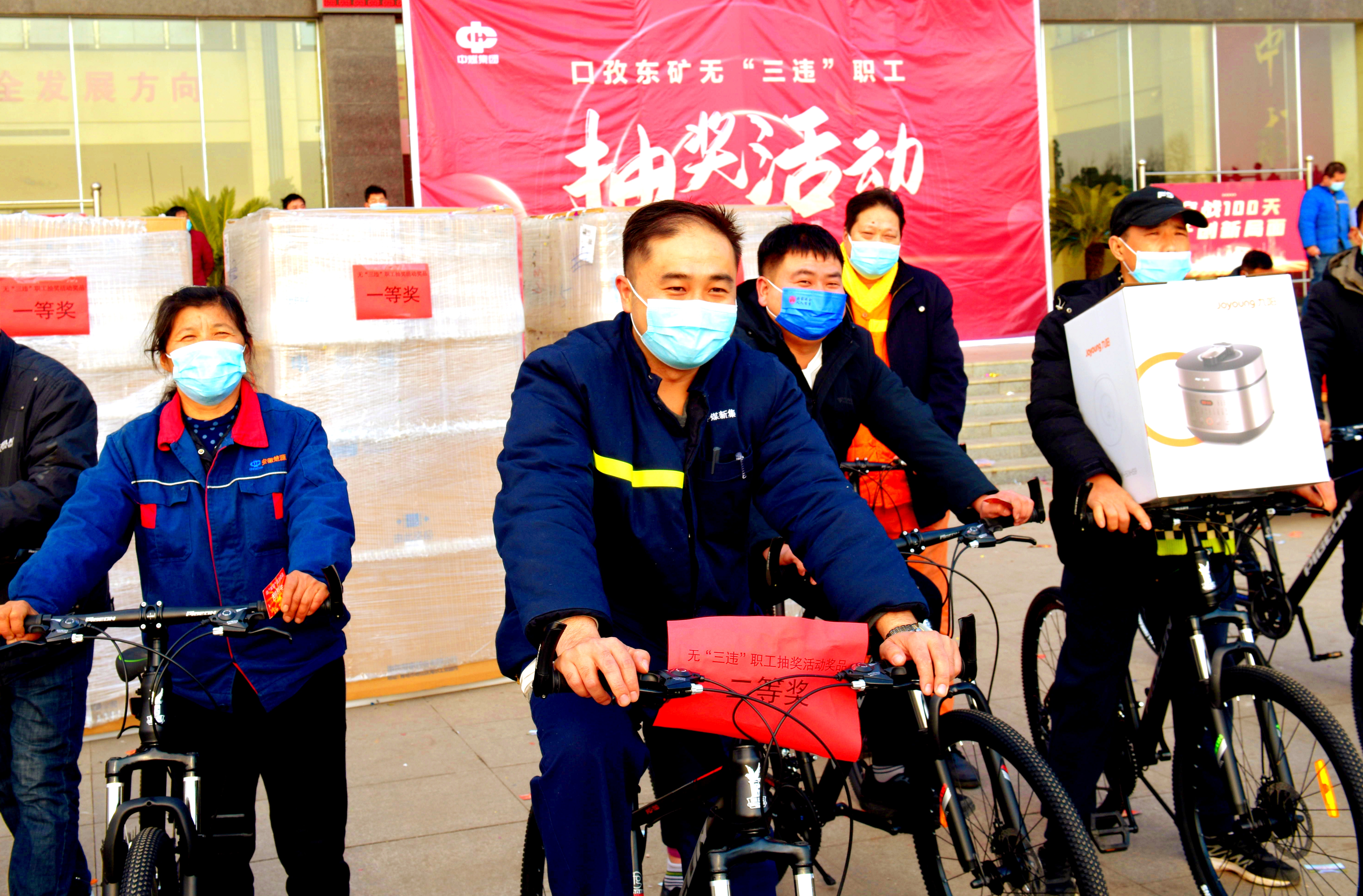 图为,抽奖现场,获奖职工骑着抽到手的山地自行车,在镜头前留下幸福瞬间。(计金忠 陈广瑞)