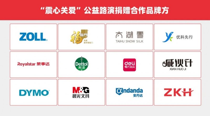 震坤行携手各大品牌方:卓尔奥医疗科技(上海)有限公司(卓尔)、中粮福临门食品营销有限公司(福临门)、苏州太湖雪丝绸股份有限公司(太湖雪)、杭州优科先行医疗科技有限公司(优科先行)、合肥荣事达小家电有限公司(荣事达)、上海曼伦商贸有限公司(滴露)、武汉武钢好生活服务有限公司(咸伙计)、及安丹达、震坤行自有品牌等。众多和震坤行品牌理念契合的同路人,共同推动本次公益捐赠项目,累计捐赠价值10万元的爱心物资,以实际行动支持“震心关爱”公益活动的推进。