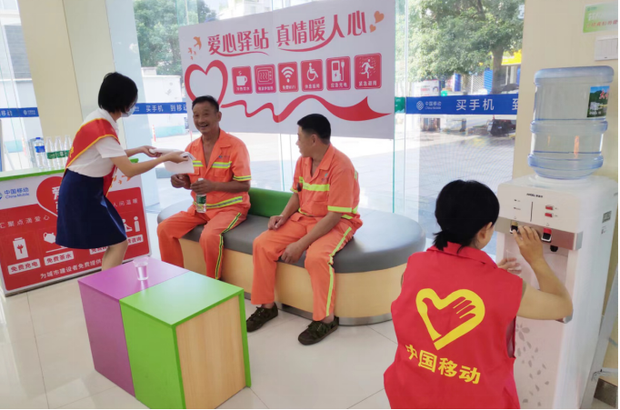 在营业厅设置了避暑休息区,桌椅、饮水机、小药箱、手机充电器等便民服务基础设备一应俱全,专门为老年人、残疾人、快递小哥、环卫工人等户外工作者提供降温避暑需求,在这里,户外劳动者们可以进入驿站专区避避暑,歇歇脚,喝喝水,谈谈心。通过提供力所能及的帮助,为他们在炎炎夏日送去一抹清凉。