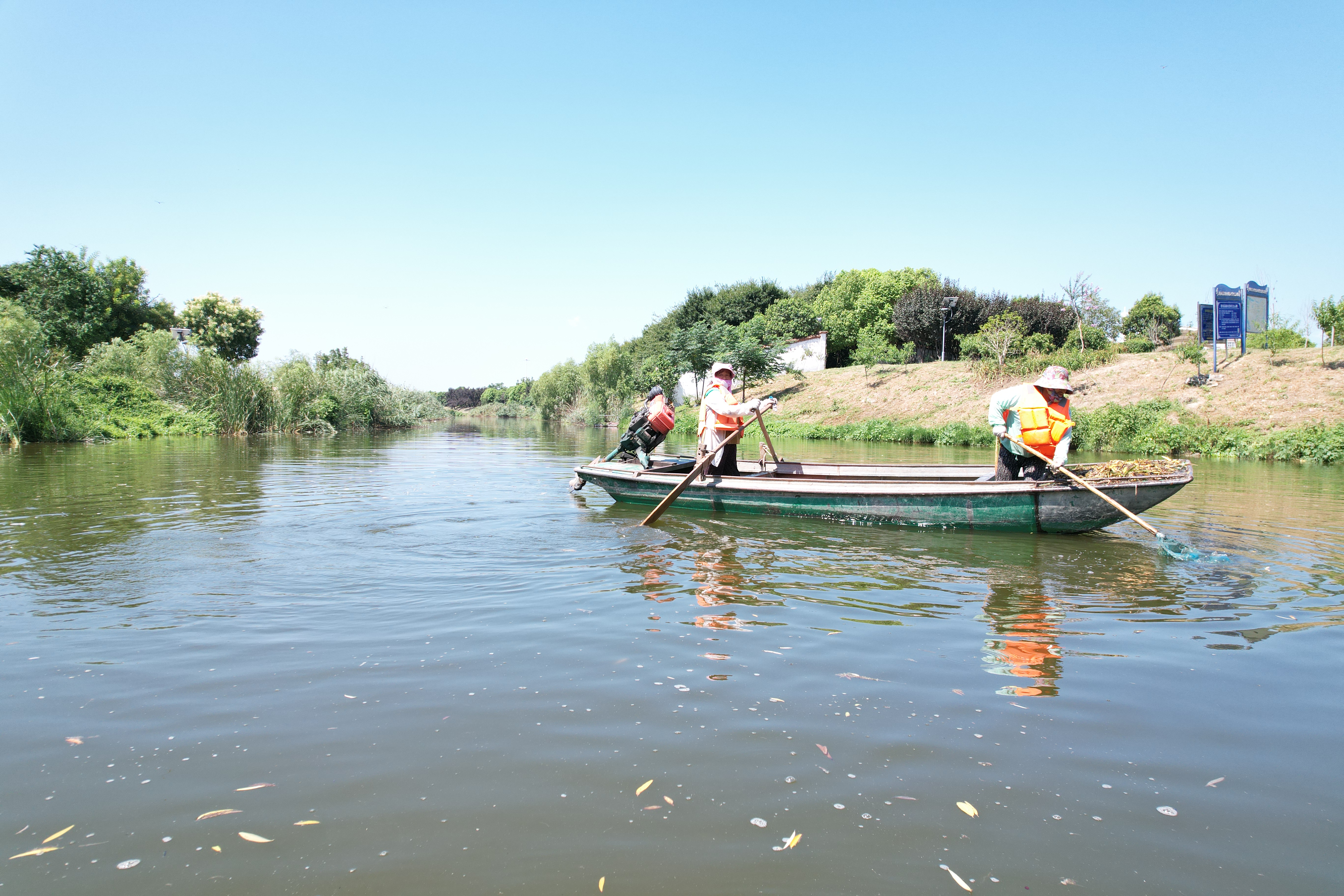 记者登上一艘打捞船,与正在作业的工作人员进行交流。“师傅,您觉得这项工作辛苦吗?”工作人员擦了擦额头的汗水,笑着回答:“辛苦是肯定的,但看到迎河一天天变得干净,心里觉得特别值!”简单的话语,透露出他们对这份工作的热爱和对迎河的深厚感情。