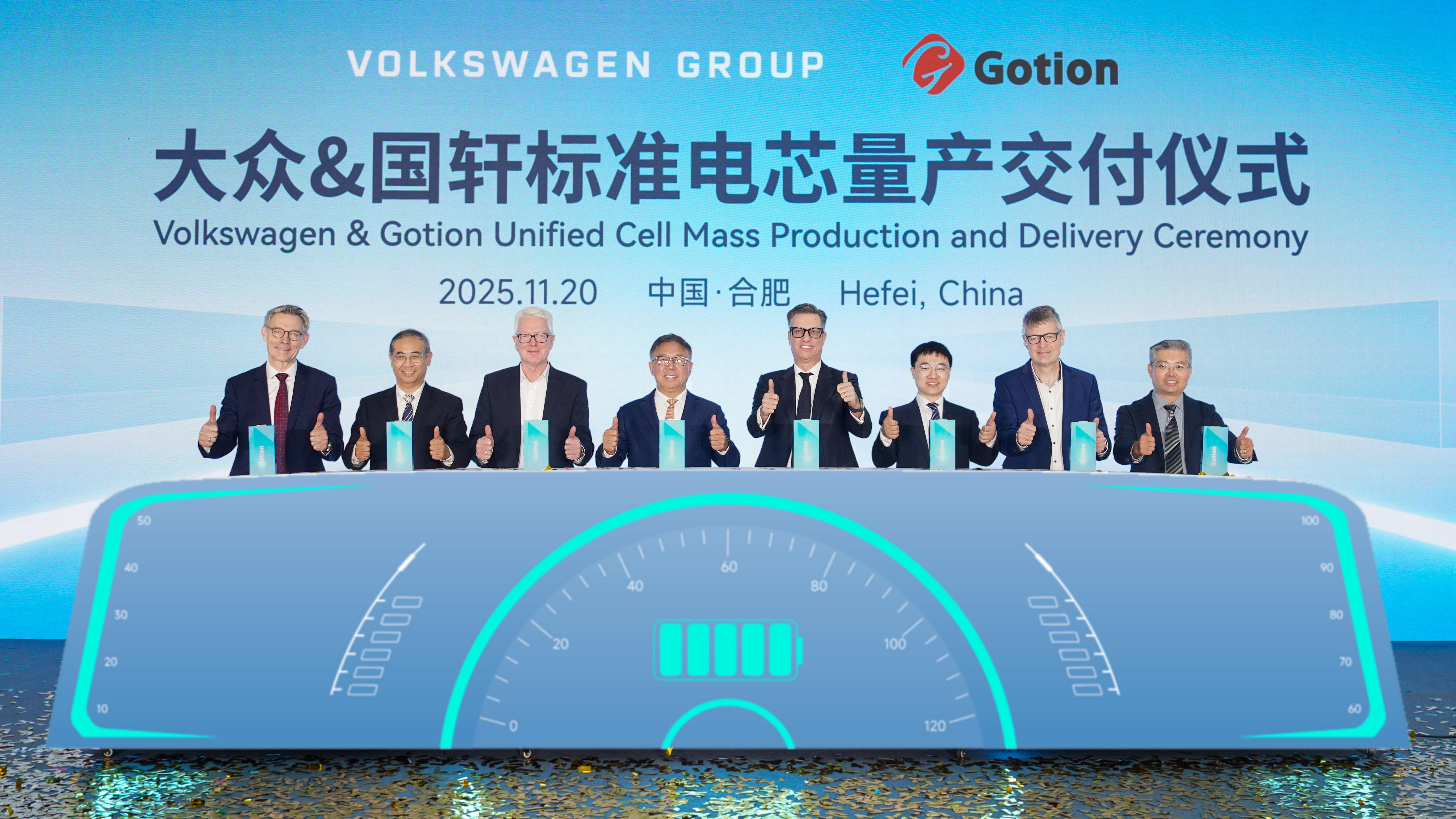 20日上午,国轩高科合肥基地新站UC工厂铁锂车间内,汇聚了来自大众汽车集团、大众汽车(中国)、PowerCo、卓越电池中心等的核心管理层。随着现场嘉宾将一枚枚标准电芯插入启动装置,码表加速转动,标志着由大众与国轩联合开发的标准电芯正式开始量产交付。