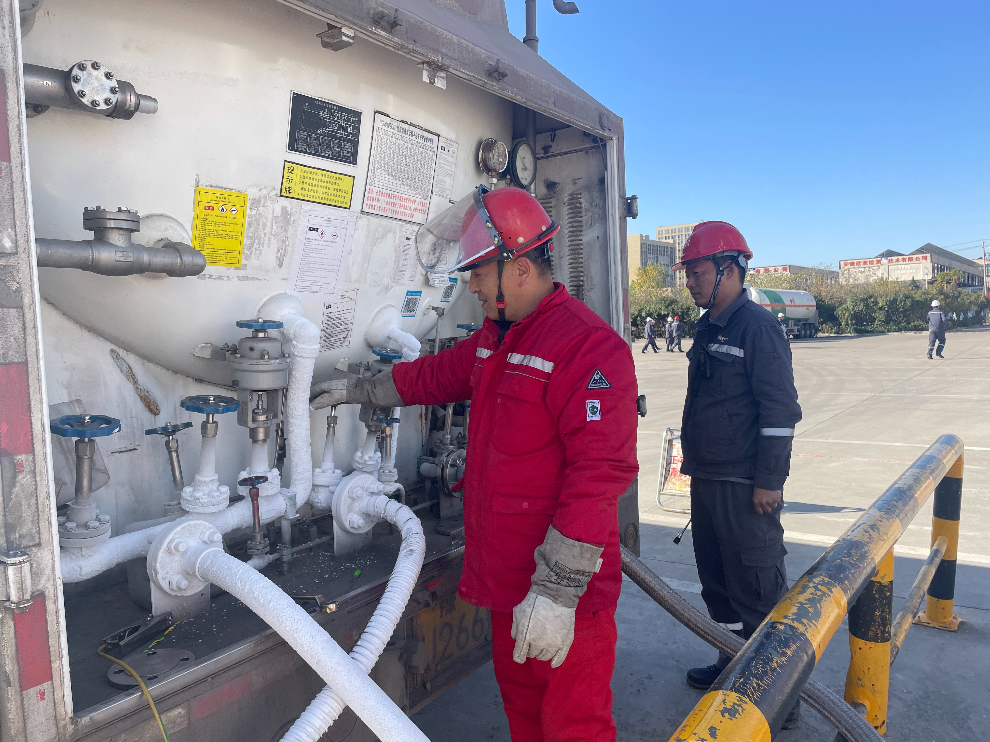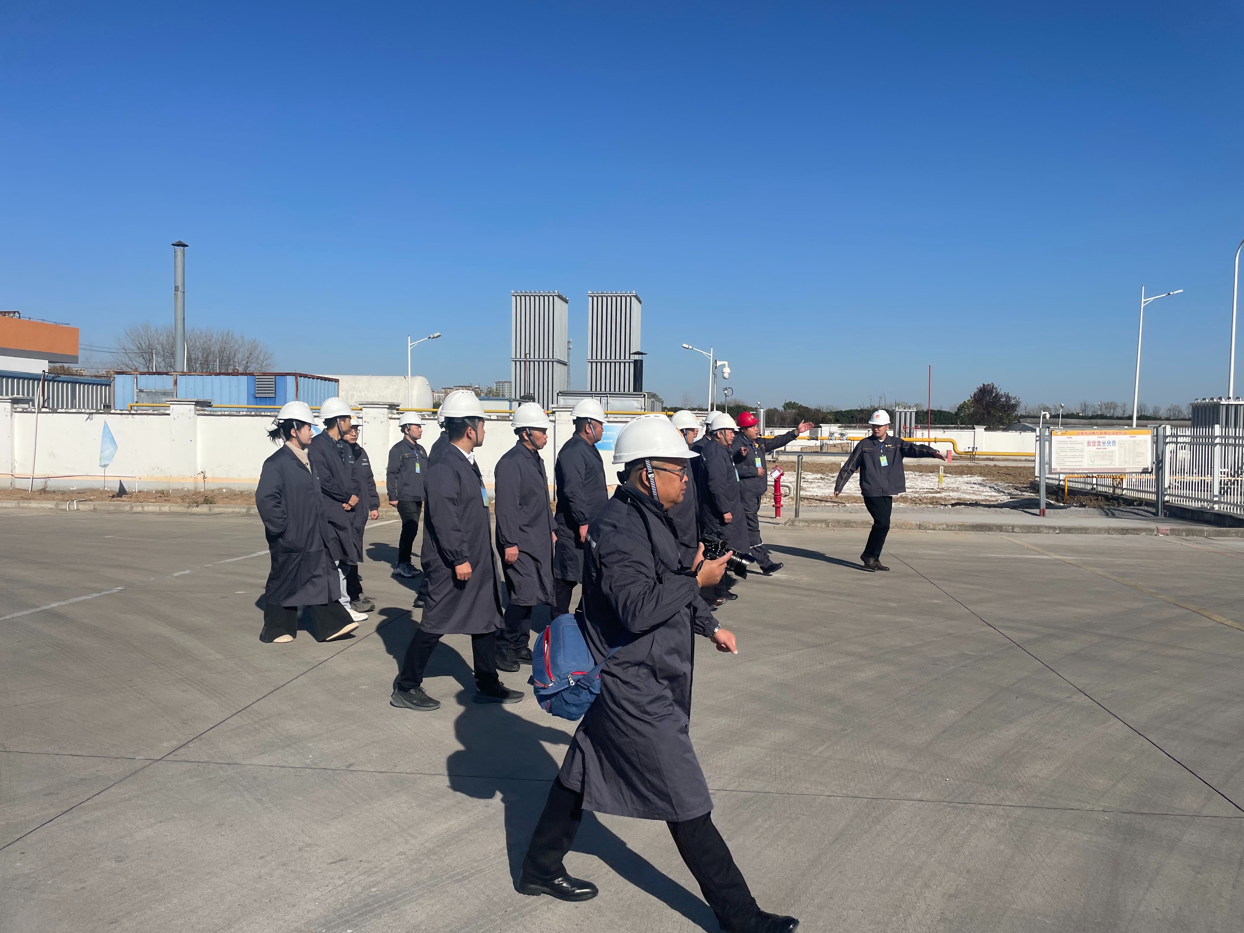 此外,参观团前往门站核心区域,深入了解气源供应全流程。作为灵璧燃气供应的“核心大脑”,调度呼叫中心24小时值守95777服务热线,通过RSCADA系统实时监测管网压力、温度、流量等指标,实现气源调度、生产监管全流程管控。因县域暂无机管道气供应,门站以LNG气源为主、CNG气源为辅,综合能源站日供气能力达20万Nm?,配备多台空温气化器及专用气化设备,保障燃气稳定气化输配。零下162℃的LNG储罐区、覆着“白雪”的装卸区管道、创新应用无机纳米涂层的汽化器……工作人员常年在低温环境下作业,保障汽化器正常运行,而在建的第二储罐,将让储气应急能力实现翻倍。调压加臭区通过精准调压稳定供气压力,添加四氢噻吩让天然气具备可辨识度,全方位保障下游安全平稳用气。