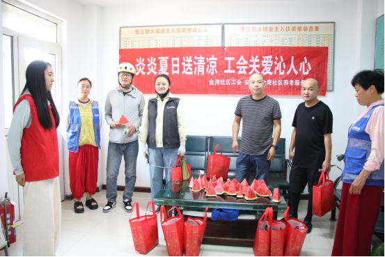 防暑降温有“凉"策,暖心守护沁人心。活动现场,驿站工作人员将新鲜切块的西瓜、装有绿豆、清凉油、藿香正气水等防暑用品和洗发水、牙膏等日用品的“清凉大礼包”送到了一线劳动者的手中,叮嘱大家注意防暑降温、劳逸结合,并感谢大家不畏高温酷暑,尽职尽责地为辖区居民的生活带来便利。“工会驿站考虑得真周到,大热天能吃上一口冰镇西瓜,真是甜到了心坎里啊!平时我们累了还能在驿站歇歇脚、充个电……”大家边吃边点赞。