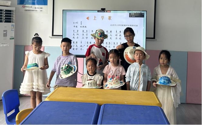 完成创作后,孩子们互相展示自己的作品、合影留念,镜头里,一张张笑脸与五彩草帽相映成趣,定格下满满的成就感与幸福感。