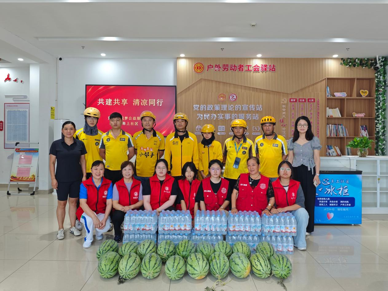 一瓶饮用水,一块西瓜,一声问候,不仅缓解了他们在高温下的燥热与疲惫,更承载着社区满满的敬意与关爱。