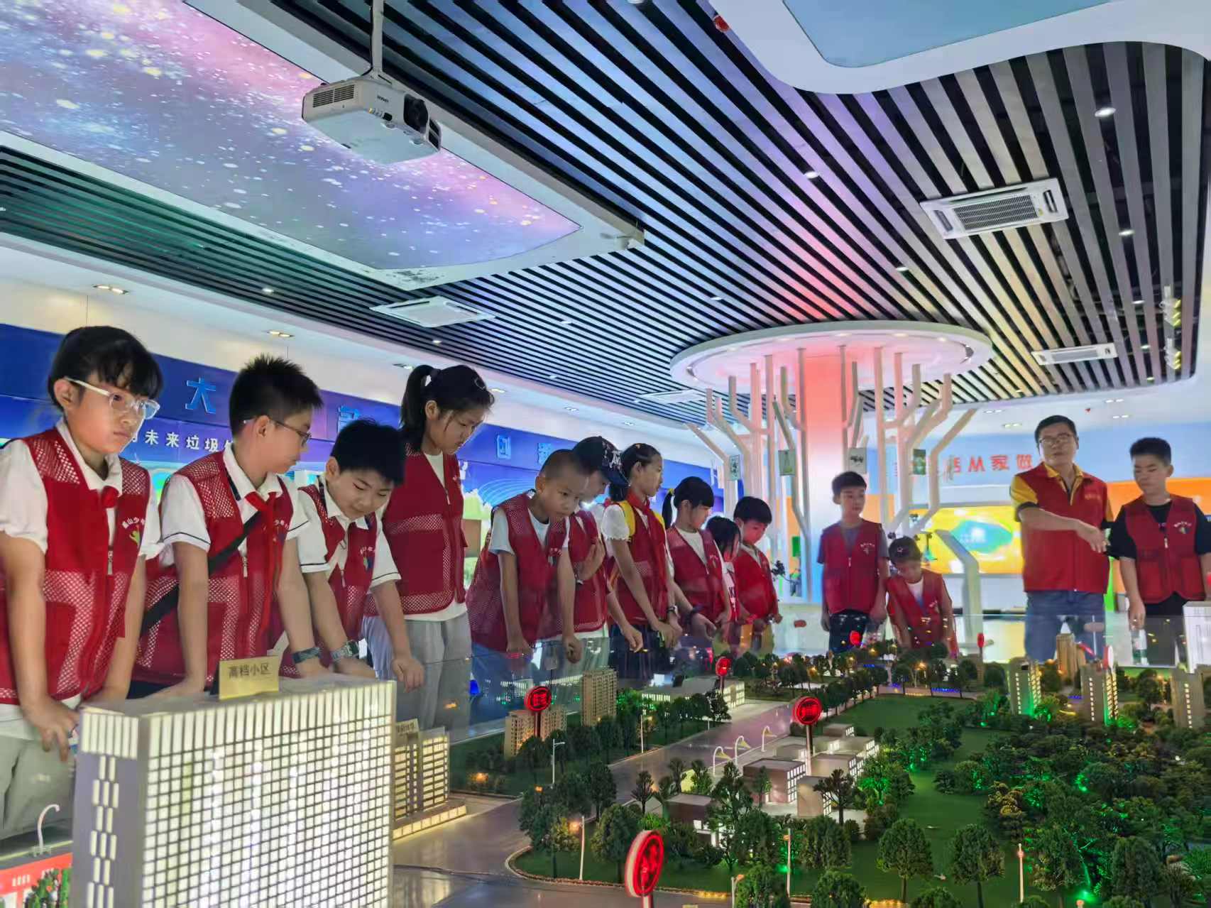 在垃圾分类科普馆,孩子们通过图文展板、互动模型系统学习了垃圾分类知识,并与馆内“变废为宝”智能机器人热情互动。机器人通过趣味问答、实物展示等方式,向孩子们演示了废旧物品如何通过科技手段重获新生。合影环节中,孩子们争相与机器人击掌,在欢声笑语中加深了对资源循环利用的理解。