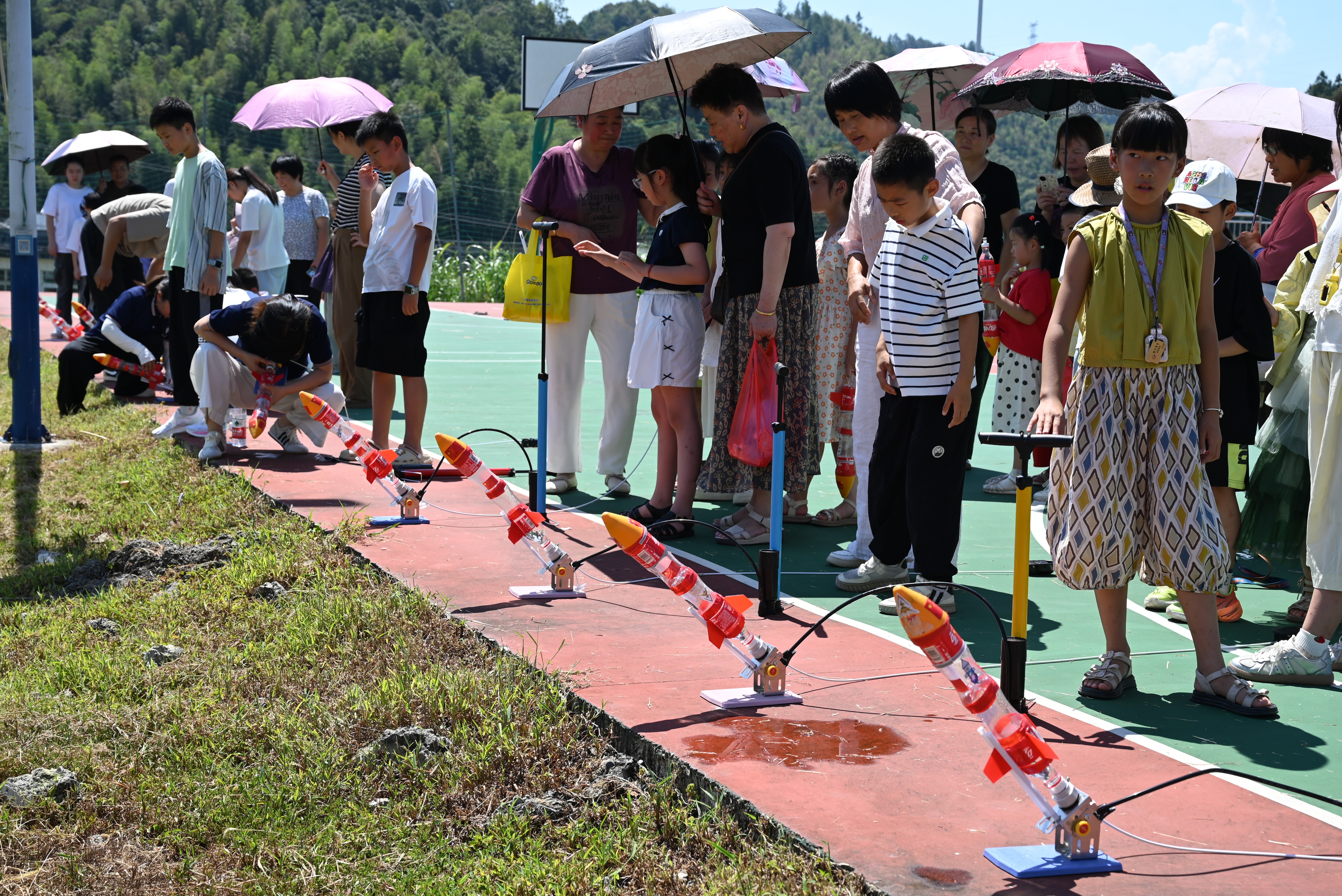 在金字牌镇金陶社区,科技工作者用生动易懂的语言,揭开了水火箭的“科学密码”,从气压推进的原理到作用力与反作用力的物理规律,一个个抽象的科学概念,通过实例讲解变得鲜活可感。随后,孩子们在科技工作者的现场演示下,化身“小小工程师”,从塑料瓶的裁剪、尾翼的固定到装置的密封,每一个细节都处理得细致到位。当一个个色彩各异的水火箭完成组装时,孩子们难掩兴奋,迫不及待地奔向户外发射区,有序将亲手制作的水火箭安装在发射架上,兴奋地按下发射按钮,伴随着“嗖”的一声,水火箭带着水汽腾空而起,现场瞬间爆发出欢呼声,成功的喜悦洋溢在每个孩子脸上。“我了解了火箭发射原理,提升了动手制作能力,还交了许多朋友,十分地开心。”学生倪佳轩收获满满。