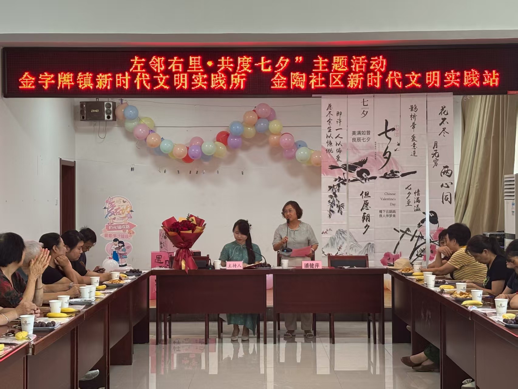 开场,金字牌镇党委委员潘健萍为活动致辞,话语中满是对社区邻里和睦的赞许,赢得了现场居民的热烈掌声。活动现场,茶香袅袅,瓜子、葡萄等茶点整齐摆放,葡萄寓意着甜甜蜜蜜、团团圆圆,为活动增添了温馨气息。随着主持人的热情开场,一句“迢迢牵牛星,皎皎河汉女”瞬间将大家带入七夕的浪漫意境中。主持人不仅分享了牛郎织女鹊桥相会的传说,还介绍了古人“乞巧”“晒书”等七夕习俗,让居民们对节日有了更鲜活的认识。