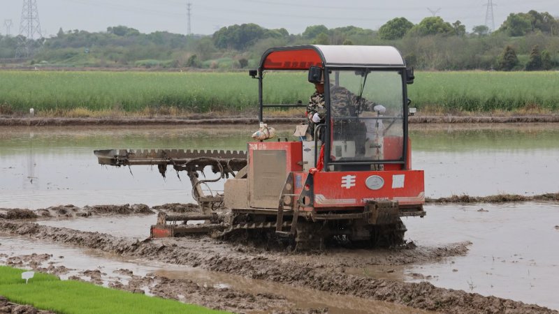 育秧大棚外的武昌圩,农机轰鸣、人影忙碌,两台耕田机开足马力,正在水田进行“三翻一平”作业,为再生稻机插秧做好前期田间准备工作。
