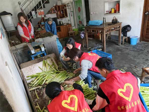 活动现场,干劲十足。志愿者们分工协作、配合默契,削笋、剥笋、分拣有序推进,一双双巧手快速翻飞,成堆的雷笋很快整理完毕。大家一边忙碌一边与农户亲切交流,详细了解笋季收成情况,用贴心服务拉近党群距离,让农户感受到党组织的温暖。