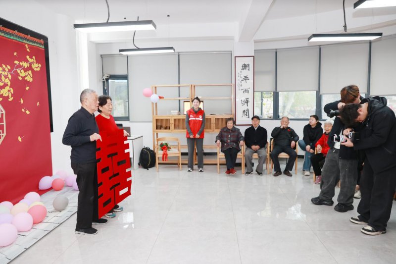 活动现场,来自各社区的16对金婚夫妇与劳模们精神矍铄、笑意盈盈。在专业摄影师的指导下,大家携手并肩重温浪漫,或昂首挺胸展现风采。拍摄过程中,老人们相互整理衣领、轻声叮嘱,每一个眼神、每一个动作都饱含着岁月的沉淀与生活的温情。拍完照,大家共聚一堂,品尝蛋糕,共享幸福时光。