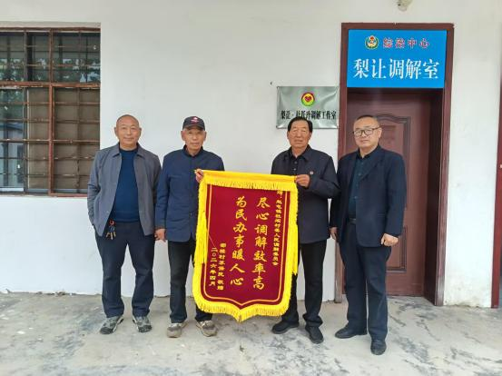 4月21日,砀山县赵屯镇杜阁村邵楼村村民苏保民专程来到村“梨让调解室”,将一面印有“尽心调解效率高 为民办事暖人心”的锦旗送到调解员手中,为高效化解矛盾、真心为民解忧的调解员点赞。