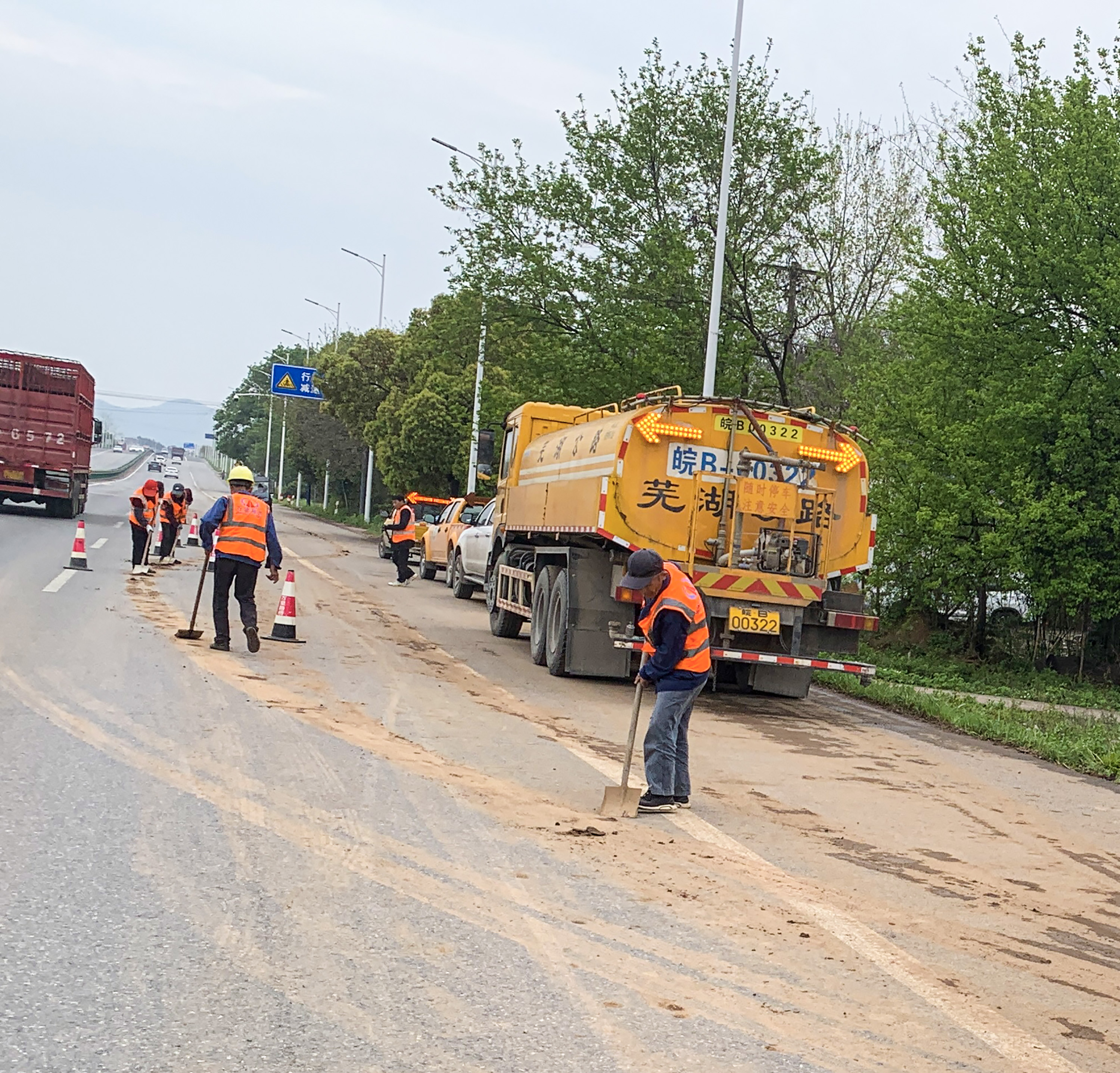 坚持以人民为中心,以“安全、清洁、有序、便民”为目标,扎实推进省第三生态环境保护督察交办信访件精细化管理。在繁阳镇,第五、六批环境信访件“繁昌区中央公园小区附近道路货车噪声严重扰民问题、繁昌区孙村镇枫墩村上将方向,每天大量运输车向几个选矿厂运送红土,散发刺鼻气味、抛 洒严重,导致路面积尘严重,雨天泥泞不堪”。芜湖市繁昌区生态环境分局高度重视,立即与市公路繁昌分中心、区交通运输局、繁阳镇、孙村镇成立联合排查整治队伍赶赴现场,在孙村镇枫墩村发现货车在运输过程中,货车司机未将货车轮胎冲洗干净便上路行驶,导致轮胎携带了大量泥土,造成路面污染,影响市容环境。巡查组立即通知施工方立即整改,用洒水车、人工对路面进行清洗,恢复路面干净面貌。