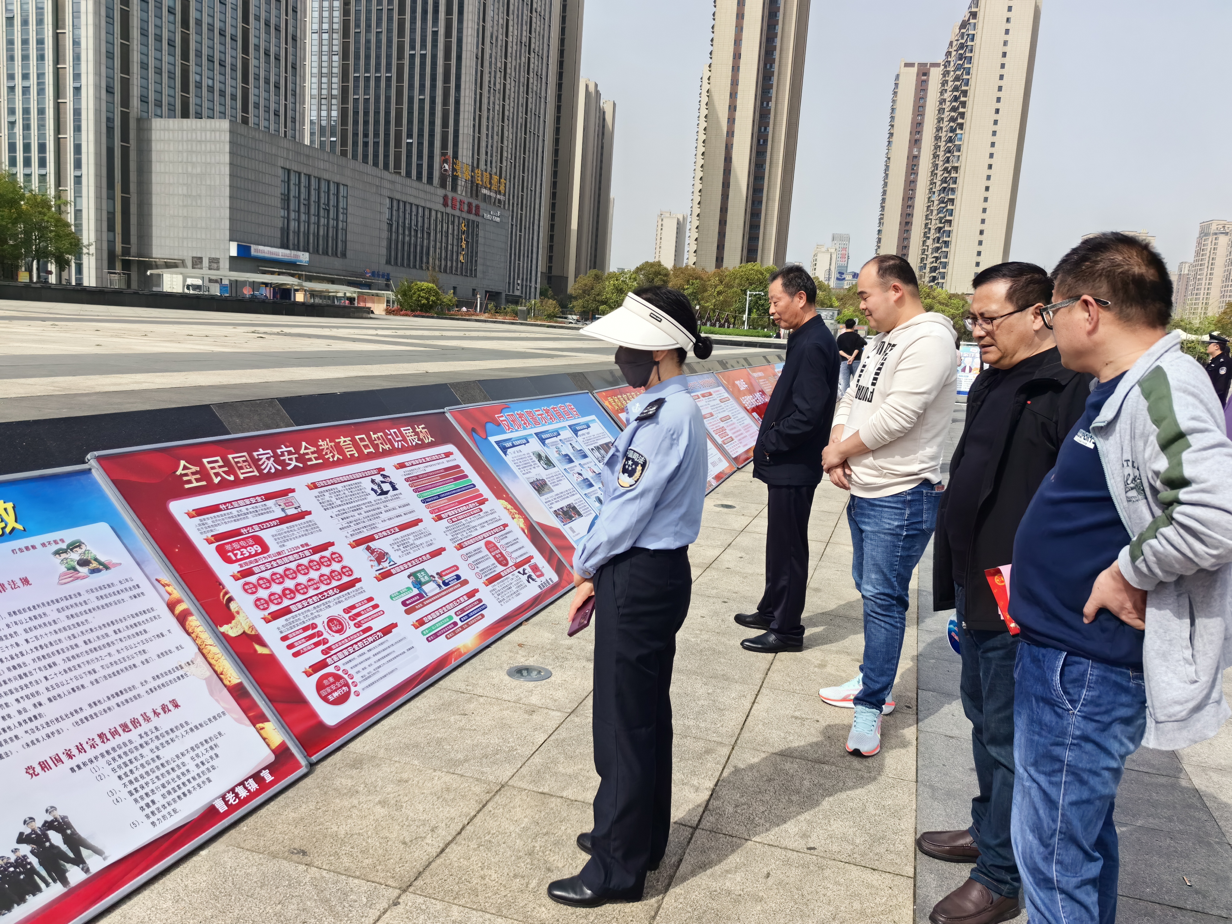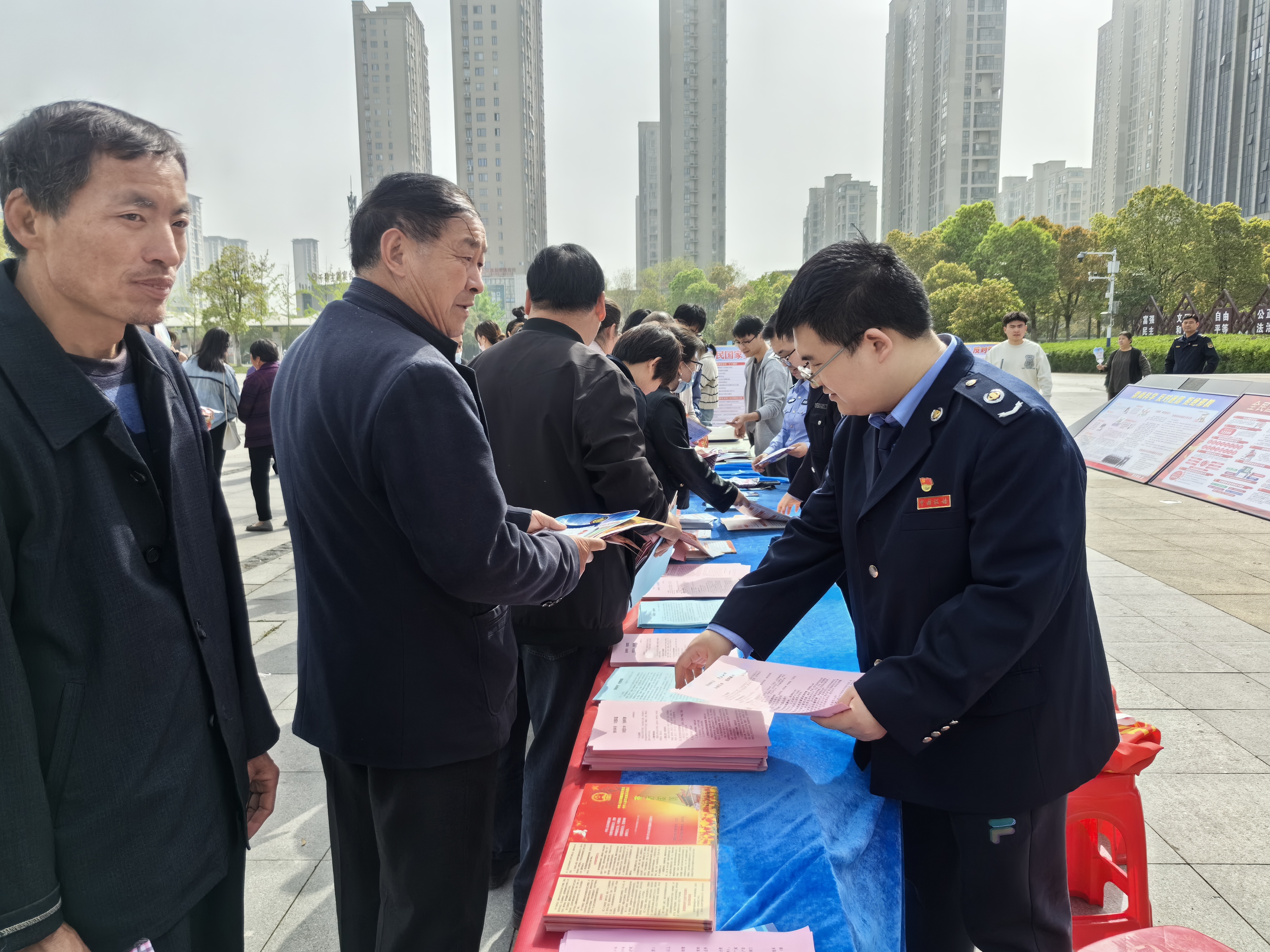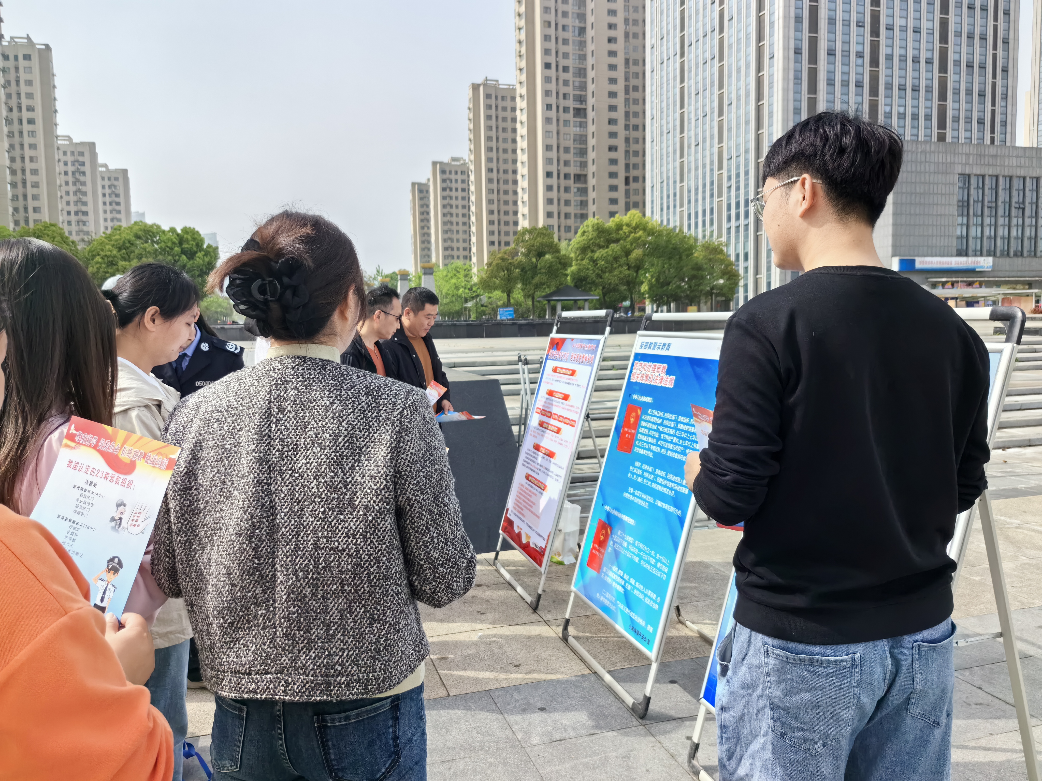 活动现场,18块精美的展板整齐排列,上面展示了国家安全的重要性、反邪教知识、国安法规等内容,吸引了众多市民驻足观看。展板旁,工作人员热情地向过往群众发放反邪、国安宣传单(折页纸),让大家在轻松愉快的氛围中了解国家安全知识。