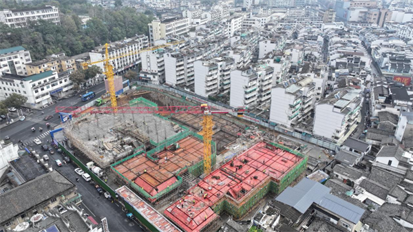 与华泽健康城的温馨热闹遥相呼应,紧邻屯溪老街的枫树巷地下停车场项目现场则是一派紧张有序的繁忙景象。钢筋网架纵横交错,施工人员正熟练地进行绑扎焊接;塔吊长臂挥舞,高效吊运物料;施工围挡内,工程正稳步推进。