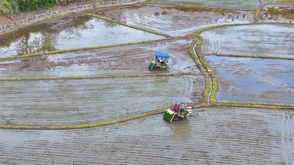 当前,正是水稻栽插的黄金时节。这两天,在祁门县粮食主产区的安凌镇,田间地头机声阵阵,农机手驾驶着高速插秧机来回穿梭作业,一株株再生稻秧苗整齐划一地植入田间,空旷的水田顿时变得绿意盎然,呈现出一派春耕忙碌景象。