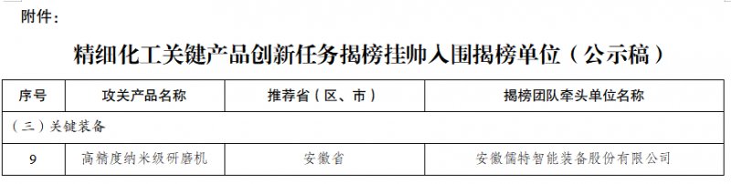 近日,工业和信息化部正式公布精细化工关键产品创新任务“揭榜挂帅”入围揭榜单位名单。安徽儒特智能装备股份有限公司(以下简称“儒特智能”)凭借自主研发的高精度纳米级研磨机成功入选。这标志着企业高端制造装备创新研发能力获得国家层面认可,也彰显了灵璧县推动制造业向高精尖转型迈出坚实步伐。