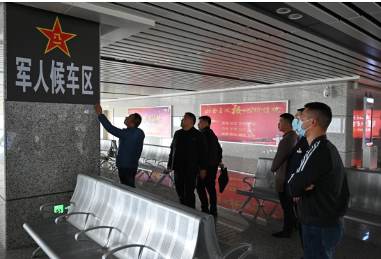 在景德镇市退役军人事务局和高铁站工作人员带领下,调研组一行来到高铁站前广场、高铁售票厅和候车厅,对军人依法优先售票窗口、军人候车区和军人专座等双拥共建、拥军氛围等情况进行现场观看、了解;对景德镇市双拥创建工作的典型经验和亮点进行了深入沟通。