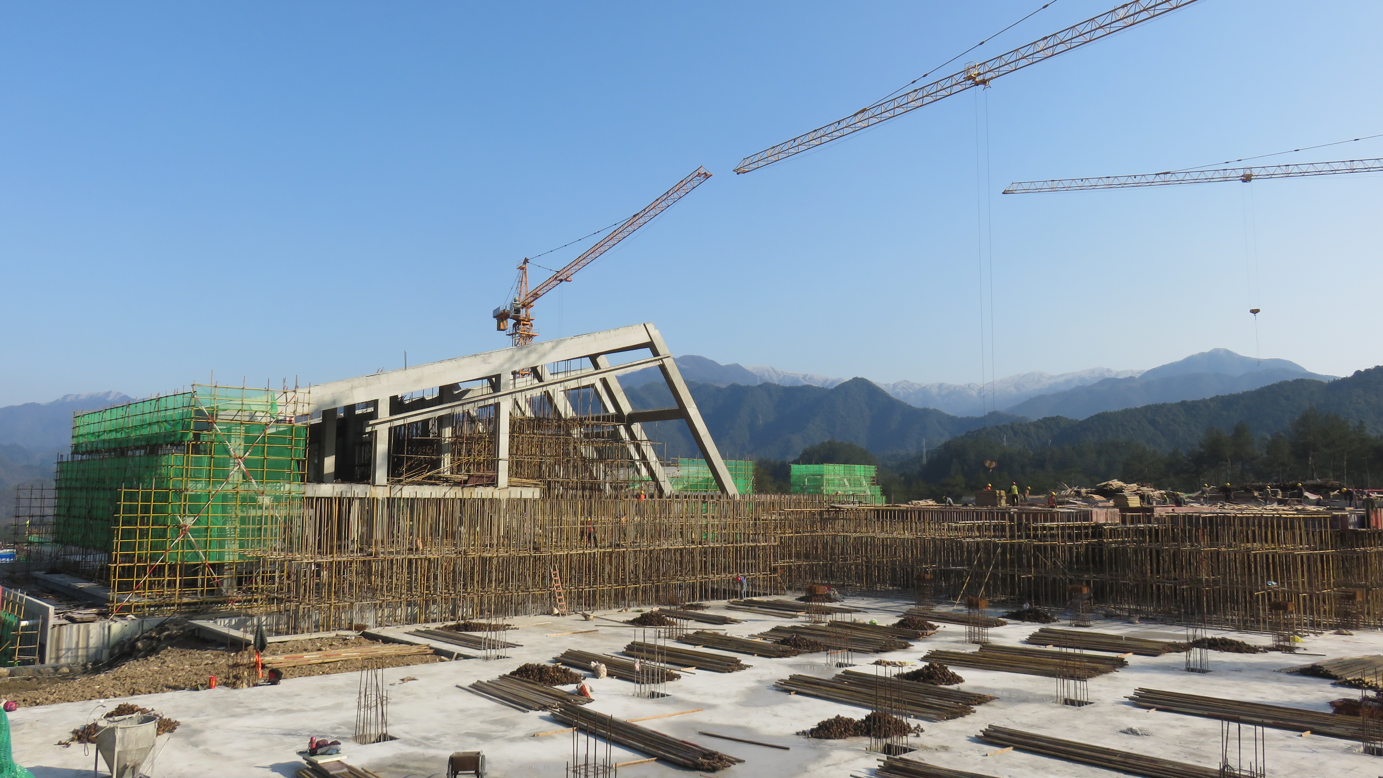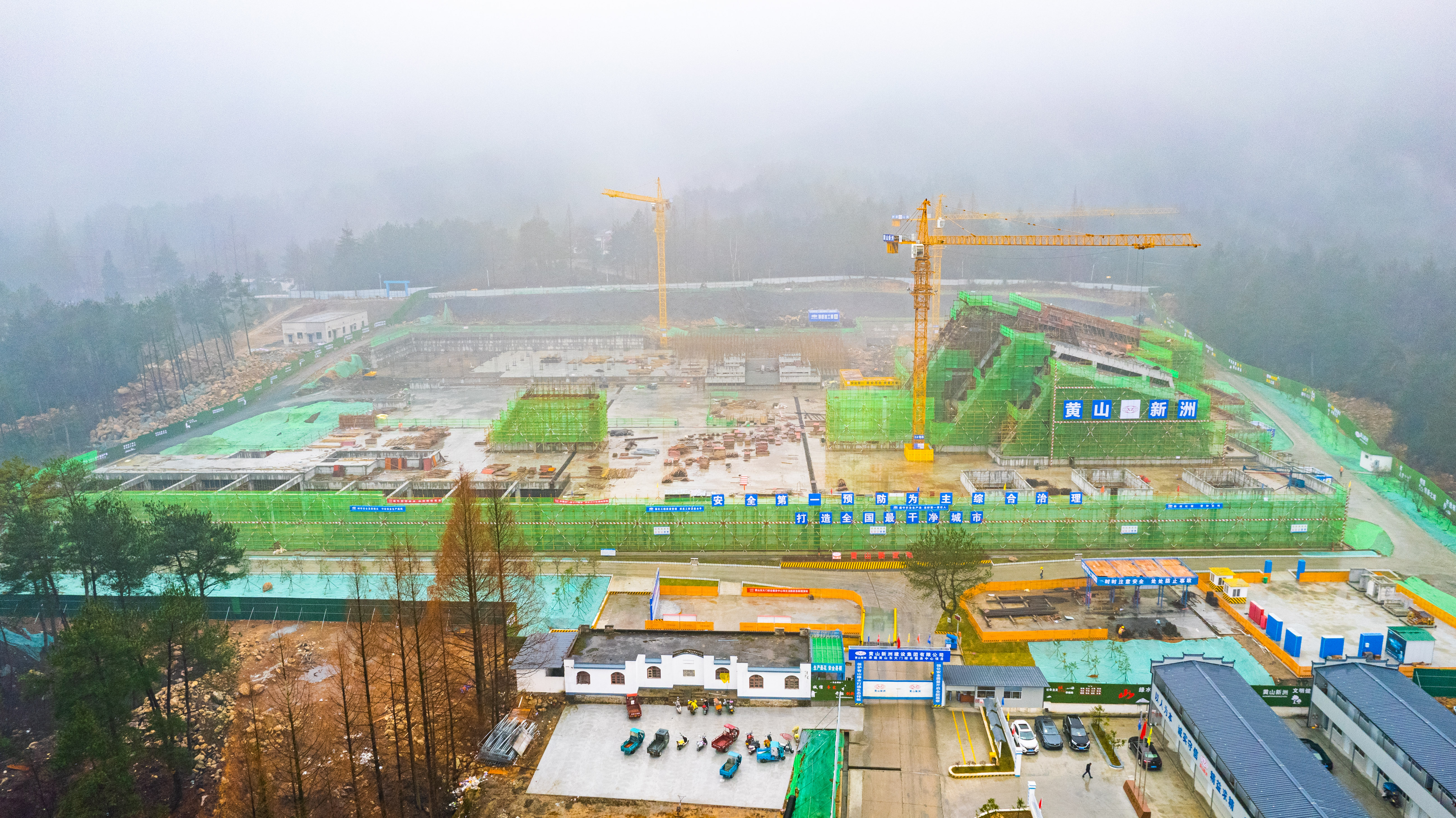 “山水人文之城、创意创新之城、开放枢纽之城、青春之城活力、美丽幸福之城……”走进黄山东大门综合服务中心项目建设现场,3米高的绿色围挡上,以写意风格装饰着传递黄山地域文化、新洲企业文化氛围的标语和图案,与远处的青山交相呼应,让工地成为群山环抱间的一道靓丽的风景线。