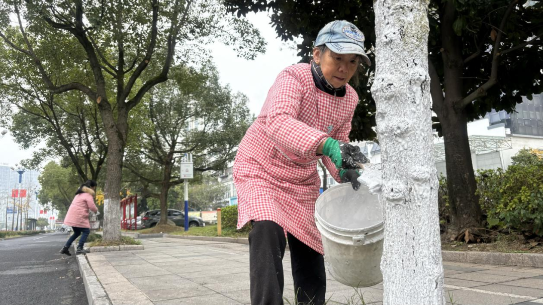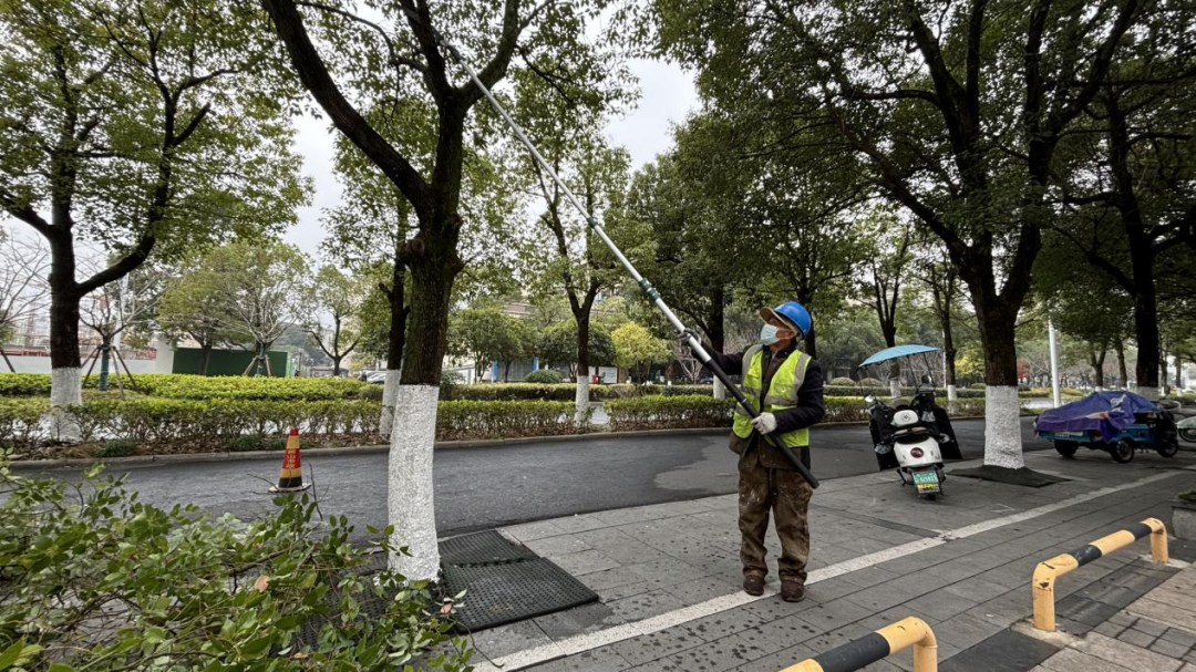 除了修剪,树木刷白工作也在全面铺开。工人师傅们将调配好的刷白剂均匀地涂抹在树干上,形成一道醒目的白色“护盾”。刷白剂采用科学配方,主要成分包括石灰、石硫合剂等,既能有效防止害虫在树干上越冬,又能起到一定的防寒保暖作用,如同为树木穿上了一层“防护衣”。“行道树冬季刷白,主要功效是防虫、防冻,减少冬季昼夜温差大造成伤害。”屯溪区市政园林管理中心综合业务股工作人员胡骏翔说, “截至目前我们已完成7000余株行道树的刷白工作,这项工作将持续到12月底。”