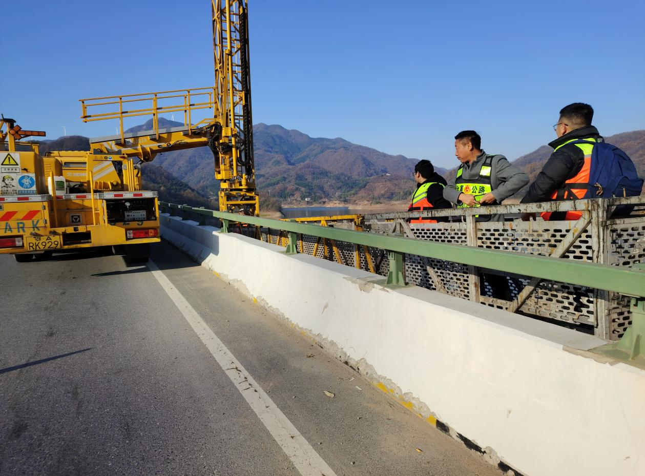 专业检测技术人员根据桥梁的特点,采用折臂式检测车、裂缝综合检测仪、钢筋扫描仪等设备,对桥梁的桥面、上部结构、下部结构进行了全面细致的外观及结构检测评估。在检测中,技术人员对发现的桥梁病害进行详细记录并建立台账。金寨县公路中心养护股技术人员全程跟踪管理,全面把控检测安全、检测进度和检测质量。
