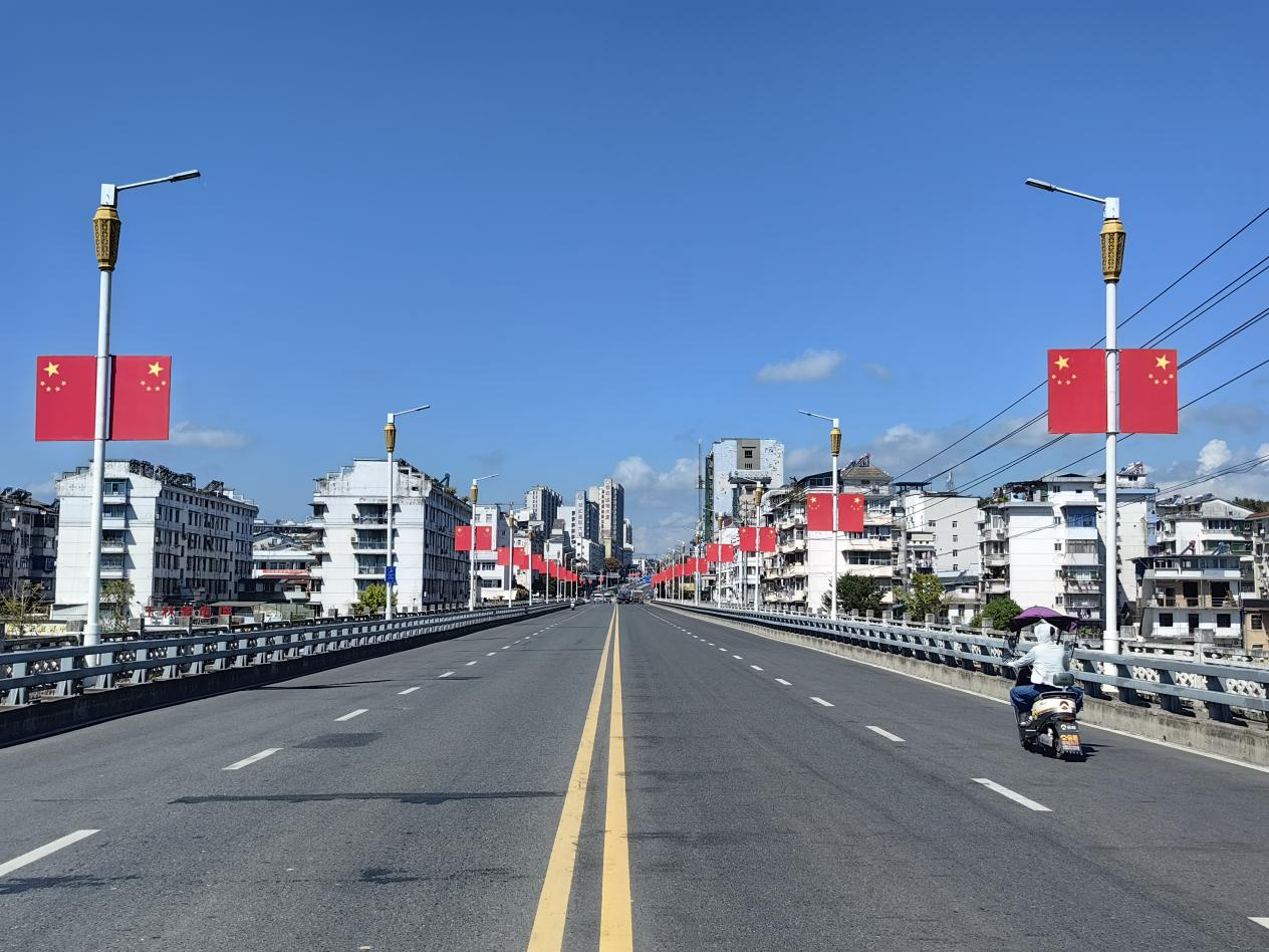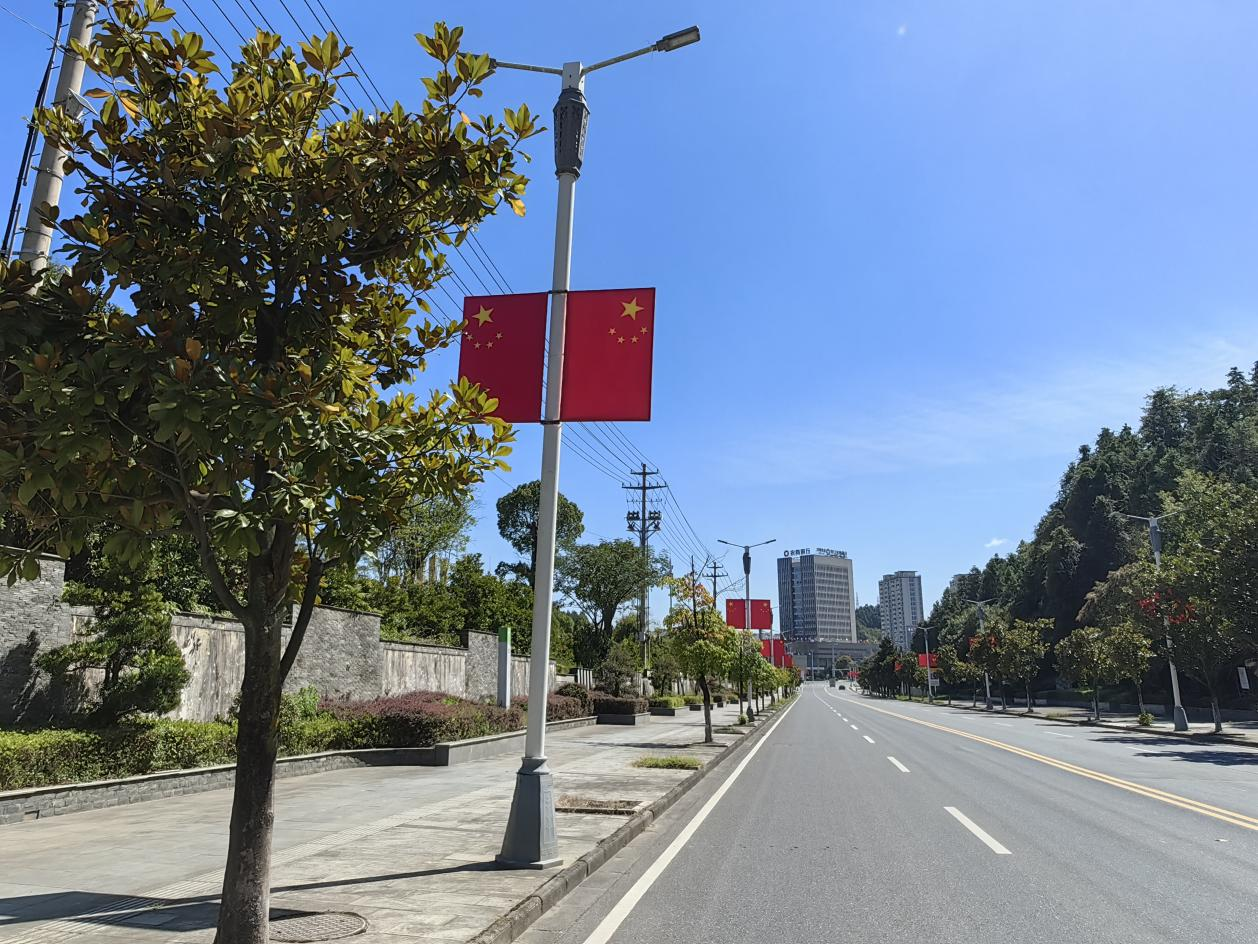 在牯牛降大道等重点路段,施工人员们登上作业车,手持工具细心调试,将一面面尺寸统一、崭新整洁的国旗整齐悬挂在灯杆两侧。鲜艳的五星红旗与沿街的绿植、楼宇相映生辉,形成一道道靓丽的“红色风景线”。