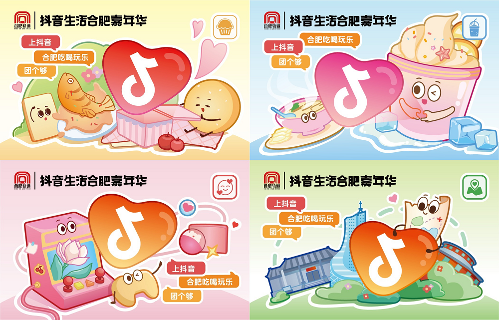 联名专属地铁卡卡面分为吃、喝、玩、乐四个设计样式,融合合肥城市特色美食和休闲娱乐等元素。消费者通过抖音搜索“合肥轨道”下单后,可在合肥地铁1号线朱岗站、2号线汽车西站等11座地铁站点兑换实体地铁卡。