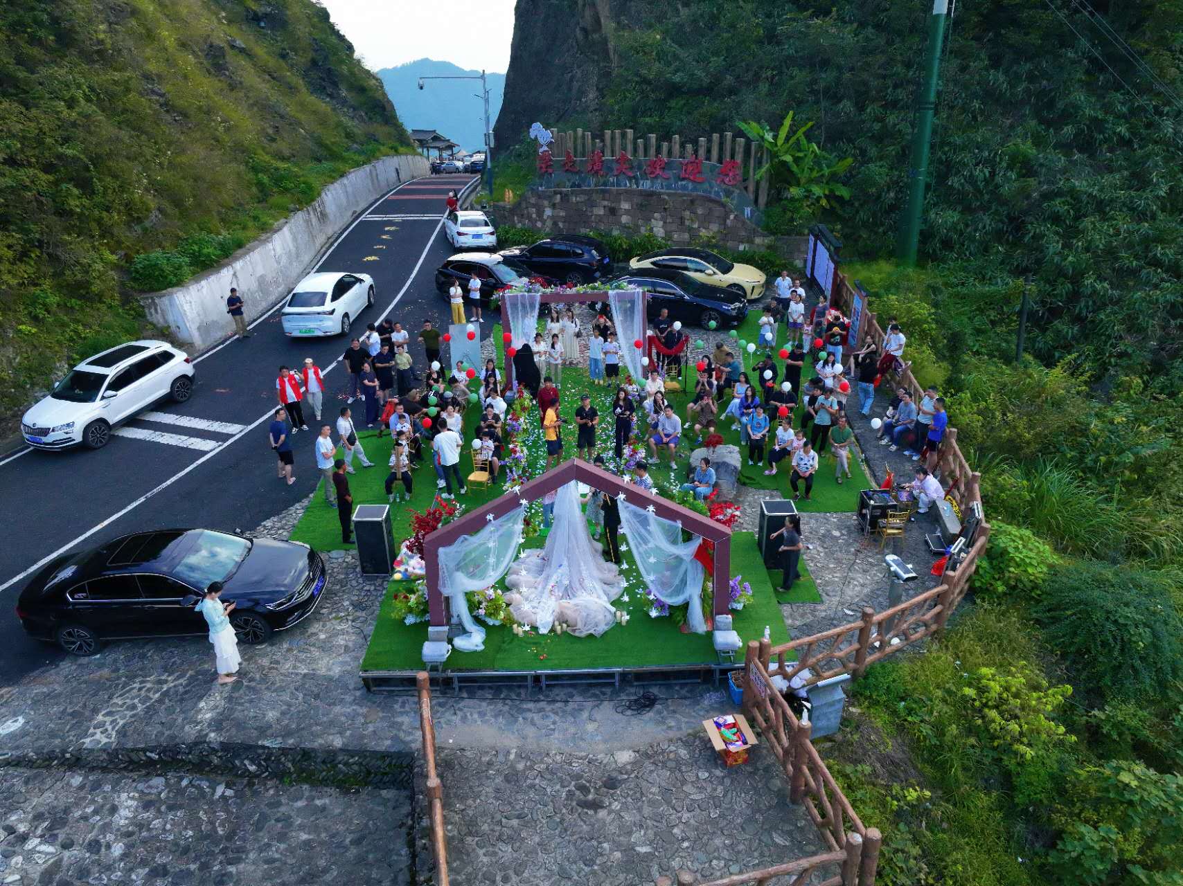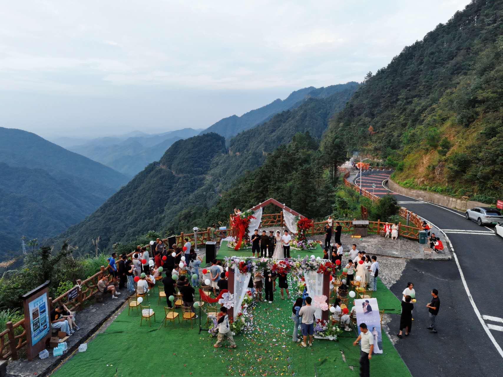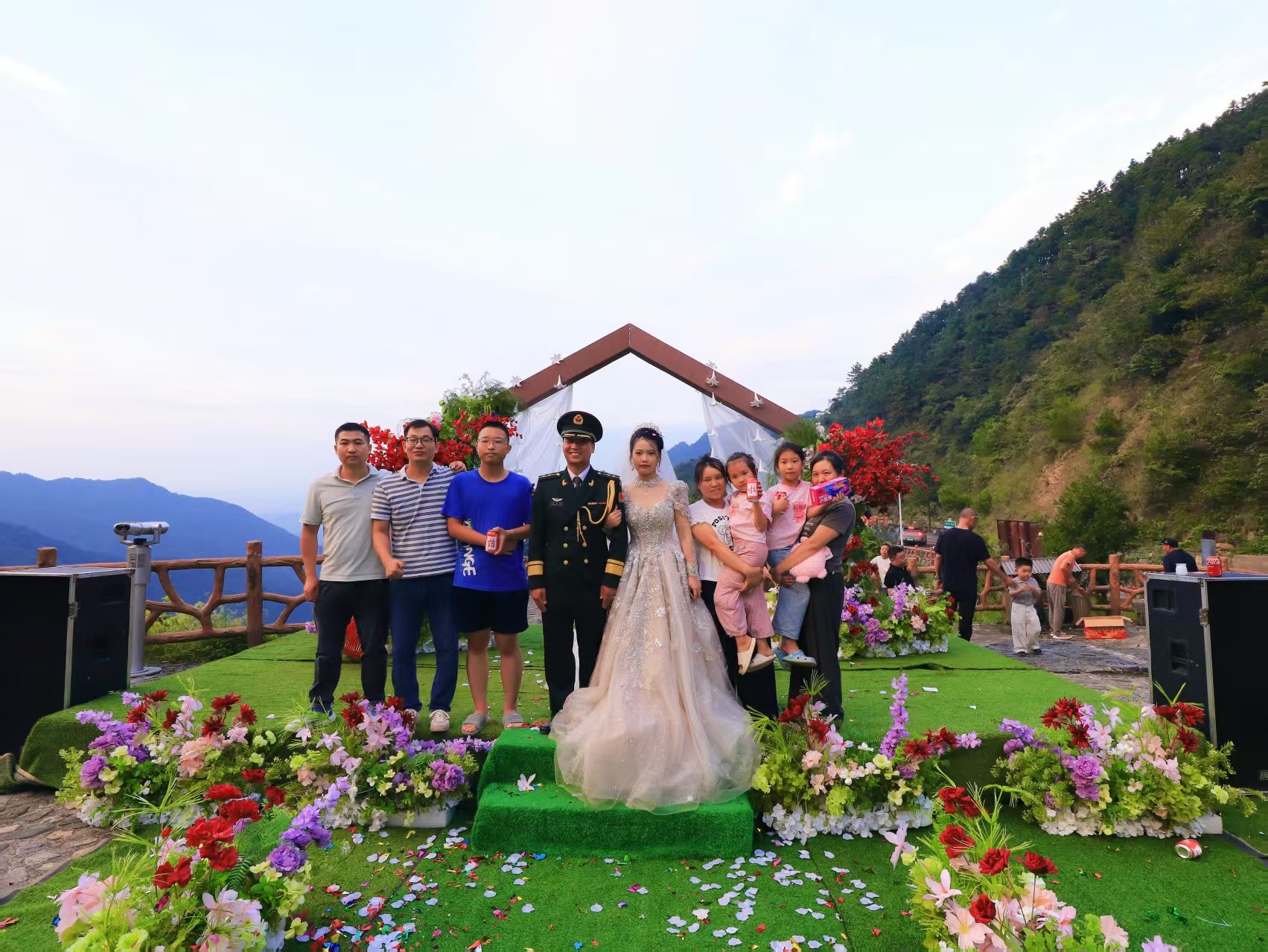 在岭顶开阔的观景平台上,松涛与鸟鸣代替了喧天的礼乐,山风轻柔地托起新娘的头纱。两位新人在青山的见证下,交换戒指,互诉衷肠,许下相伴一生的庄严承诺。现场掌声与欢呼声回荡在山谷之间,途经的游客也纷纷驻足,用镜头记录下这感人一刻,并送上真挚的祝福。